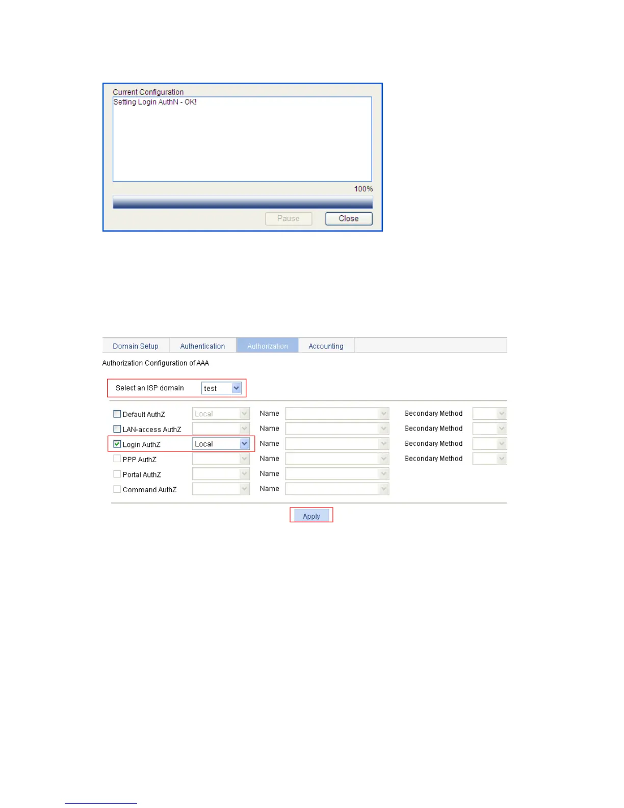Click Apply. A configuration progress dialog box appears.