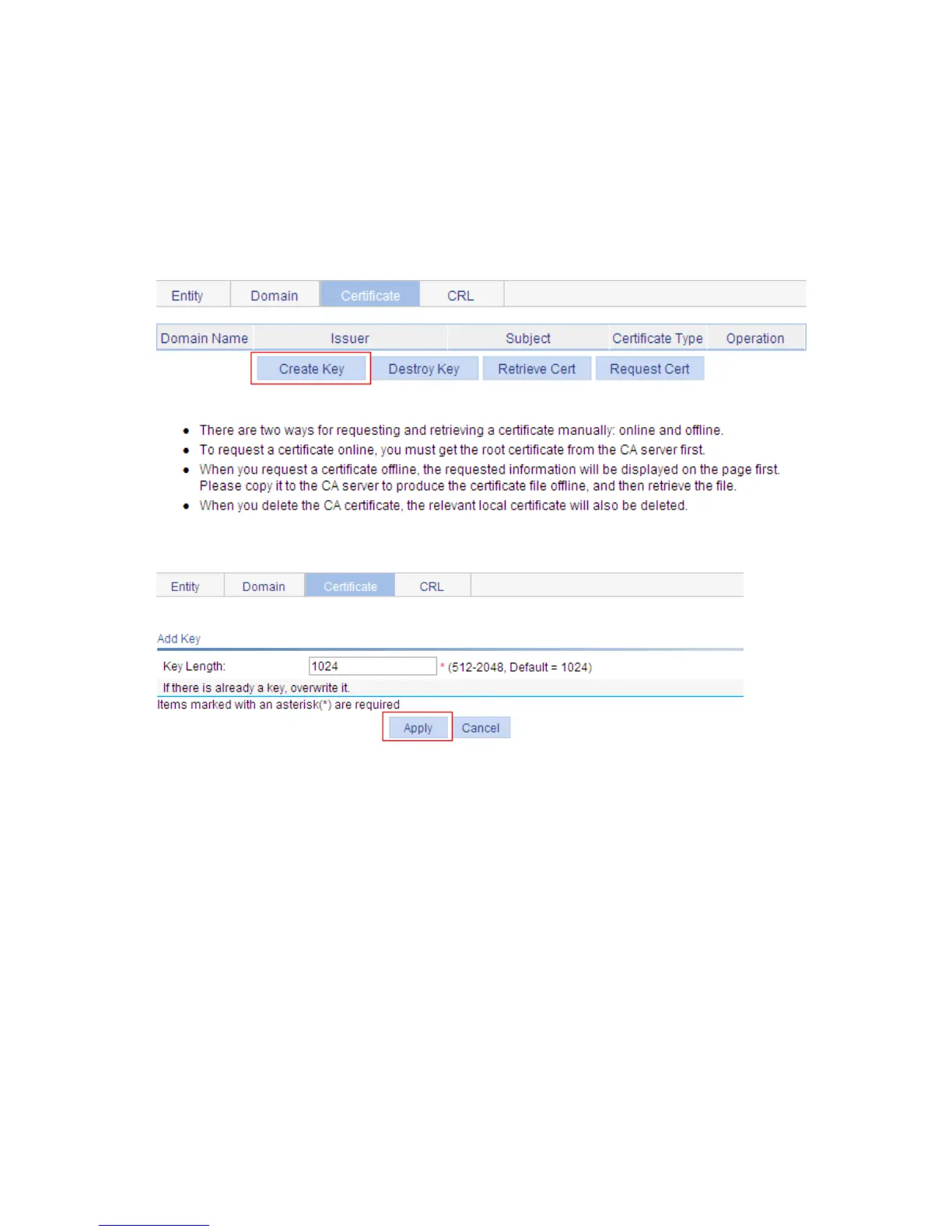 Select the Certificate tab, and then click Create Key, as shown in f, and perform the configuration as