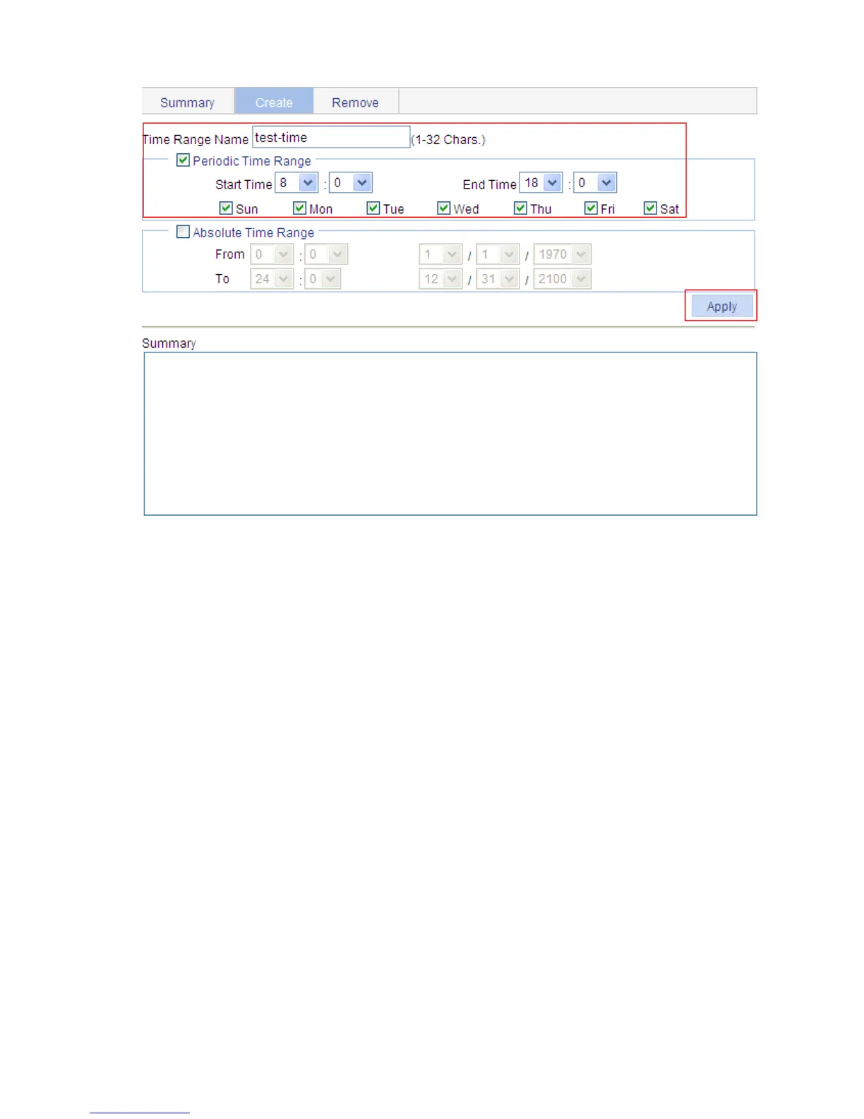 Select the Periodic Time Range option, set the Start Time to 8:00 and the End Time to 18:00, and then