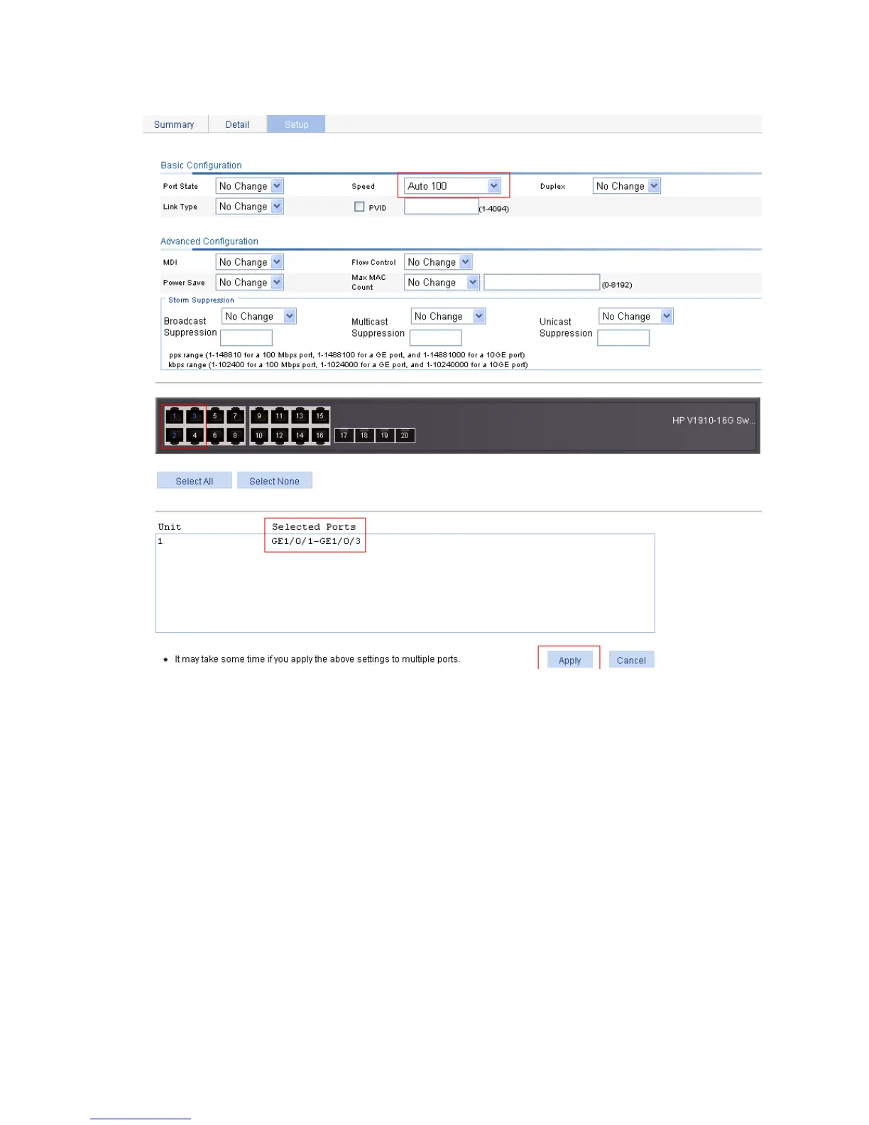 Select the Speed option to display the rate information of all ports on the lower part of the page, as