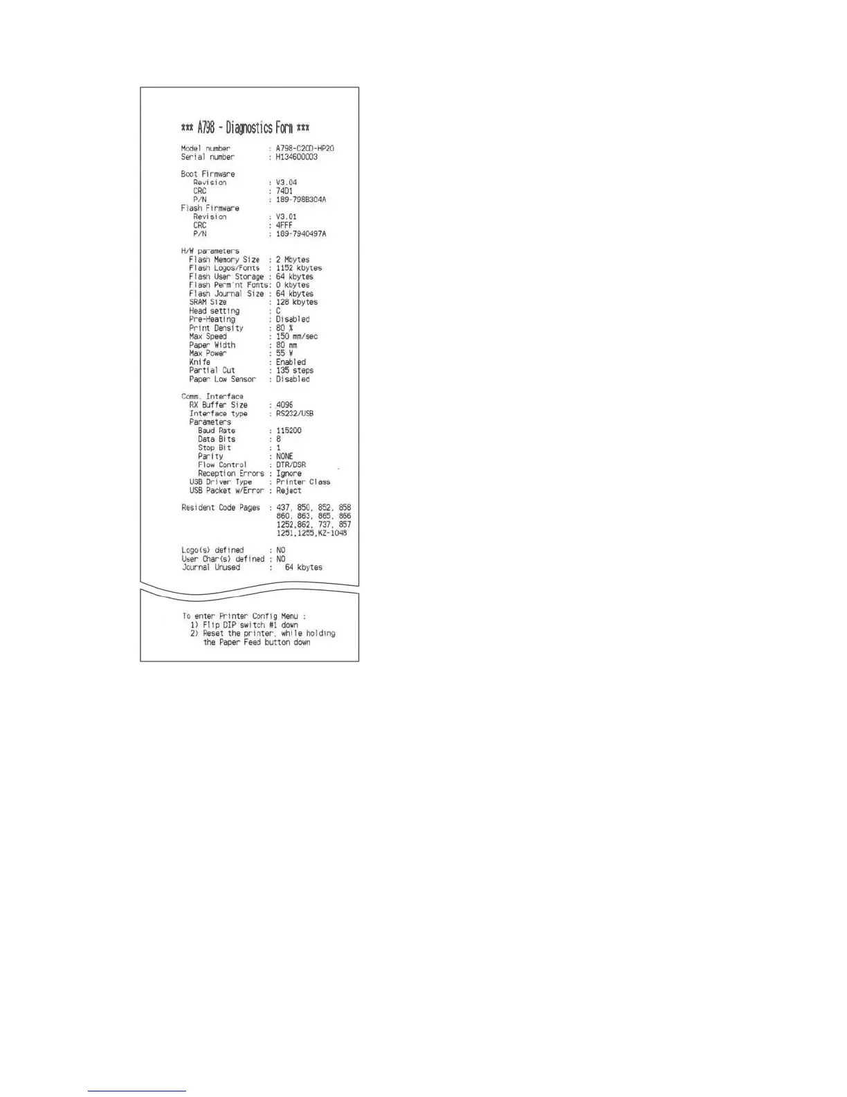 Print test and Configuration menu samples. (Shown approximately 60% of size.)