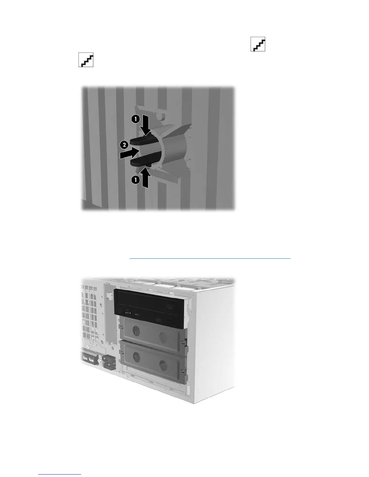 8. Rotate the EMI filler panels and the optical drive 90 degrees as shown in the figure below, and then