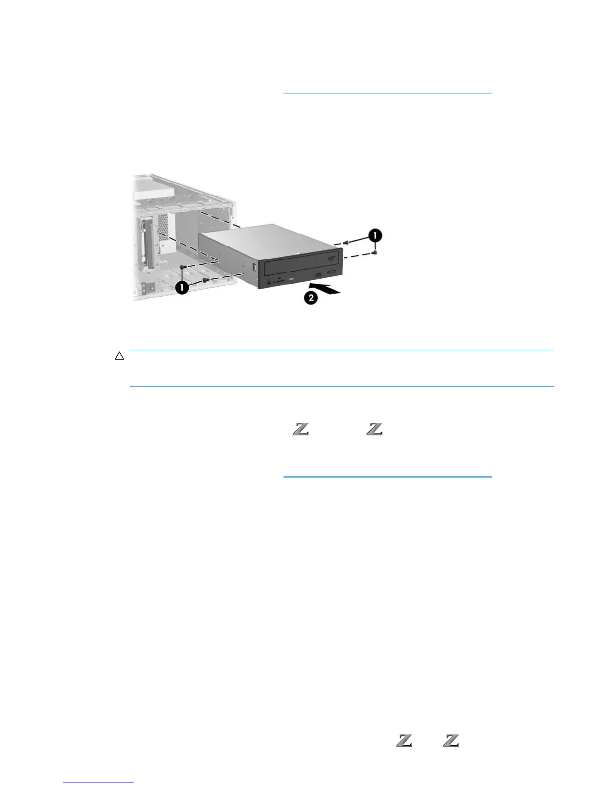 CAUTION: Ensure that the optical drive is secure in the workstation chassis by pulling the drive