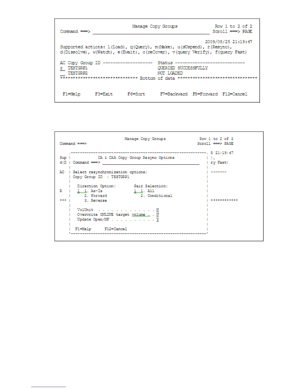 5. Specify e in the AC column of the copy group whose status you want to monitor (executing