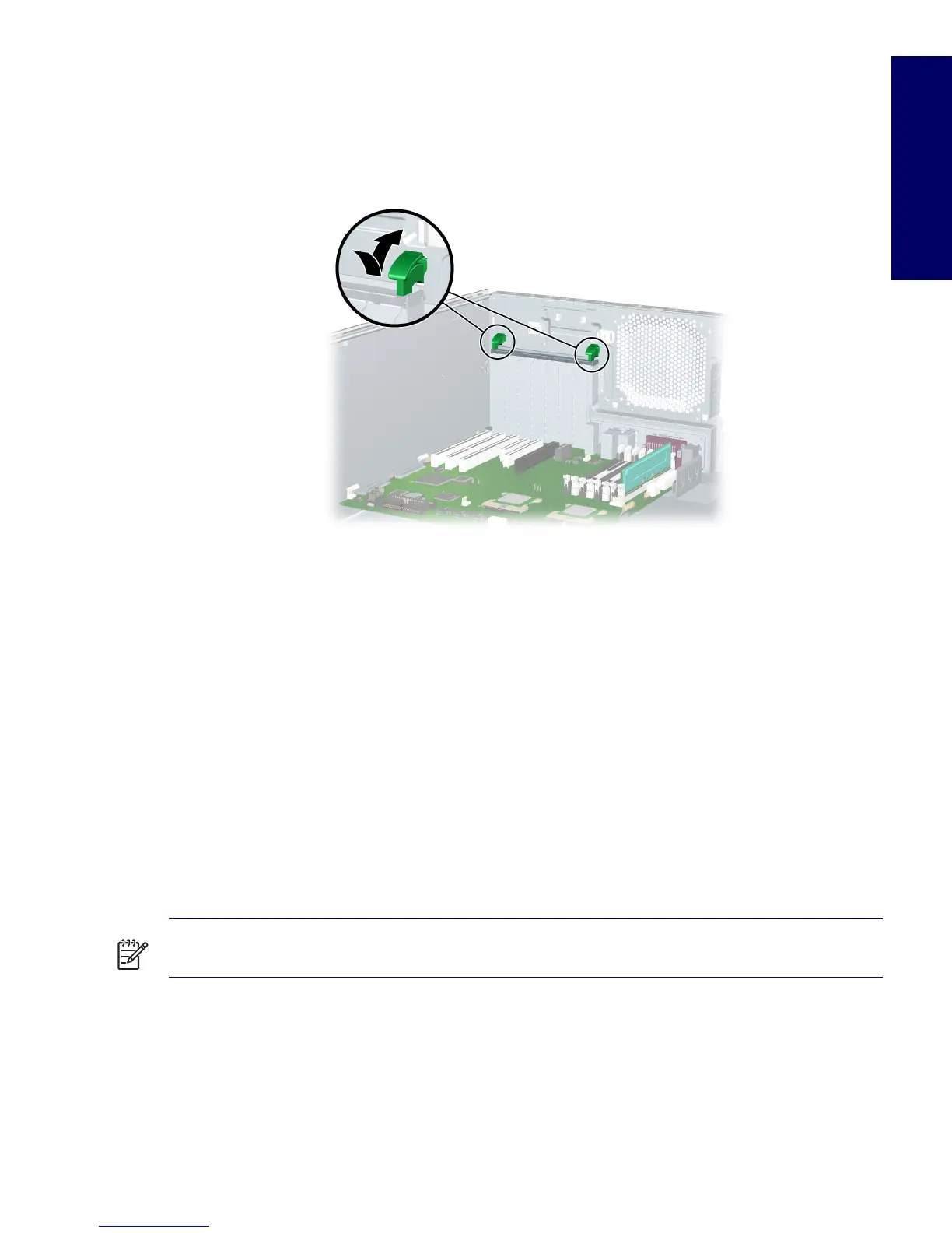2 Open the PCI retainer by pressing down on the two green clips at the ends of the retainer and