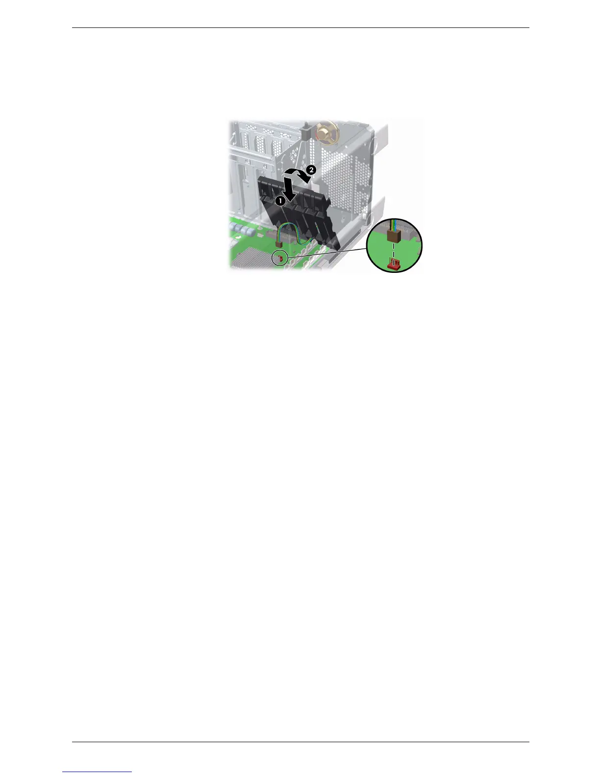 3. Lower the front fan/card guide assembly into the chassis 1, rotate it back 2, and snap it into place. Be