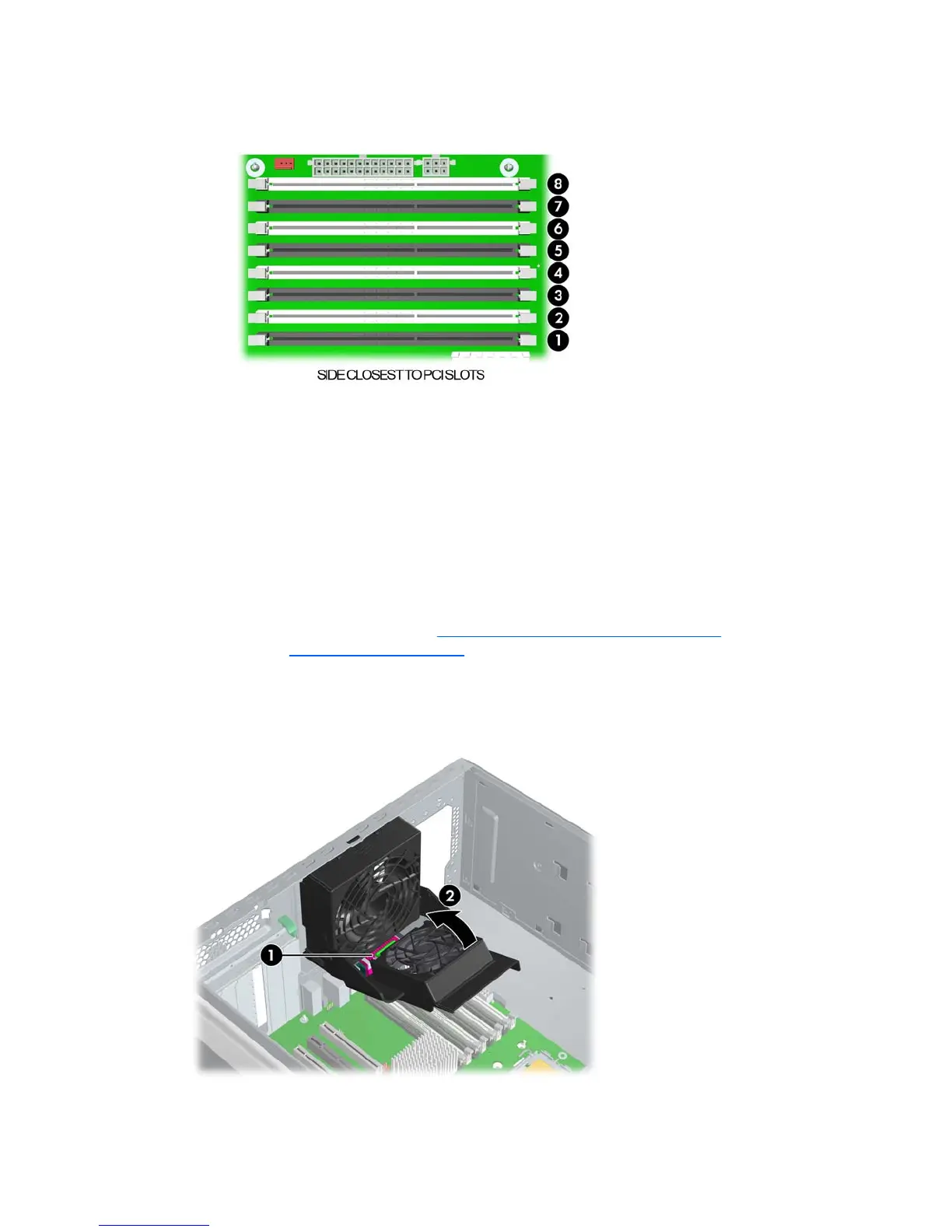 2. Press the green tab at the base of the memory fan (1) and lift it up (2) to expose the memory
