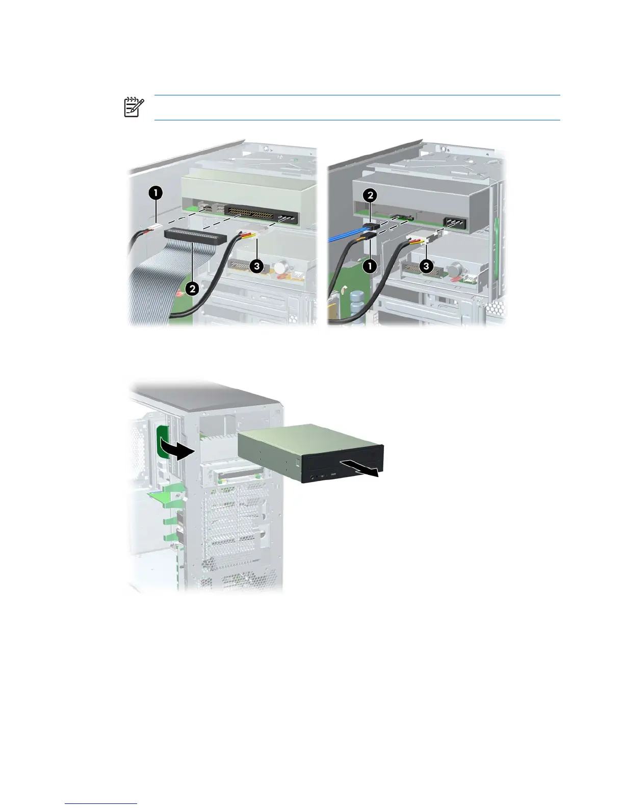 2. Disconnect the audio (1), data (2), and power (3) cables from the drive. The connector colors might