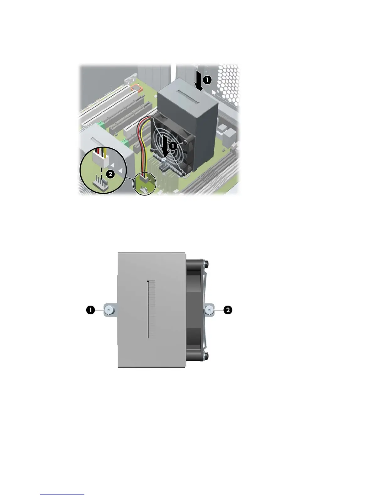 5. Connect the CPU heatsink fan connector to the system board (2).