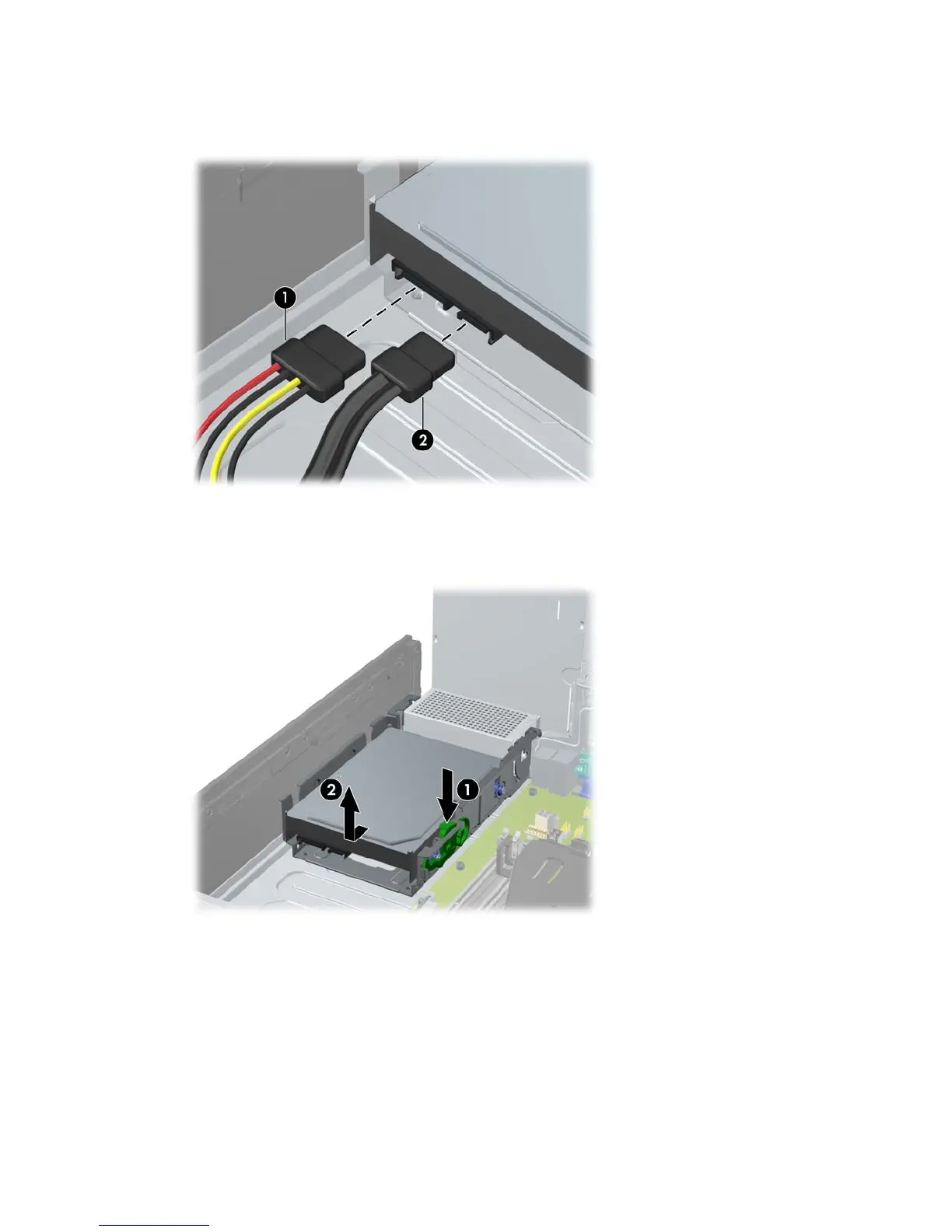 6. Disconnect the power cable (1) and data cable (2) from the hard drive.