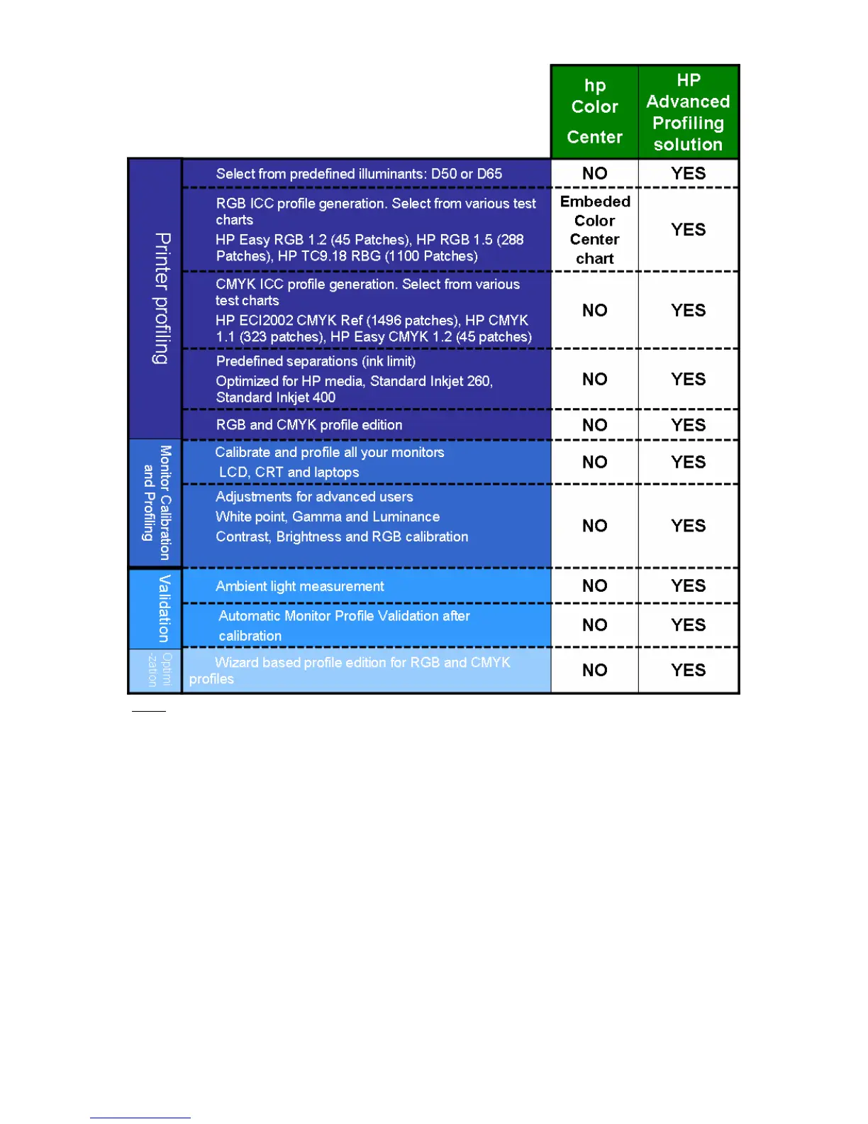 Table: Comparing Easy Profiling Solution (Color Center) and Advanced Profiling Solution features.