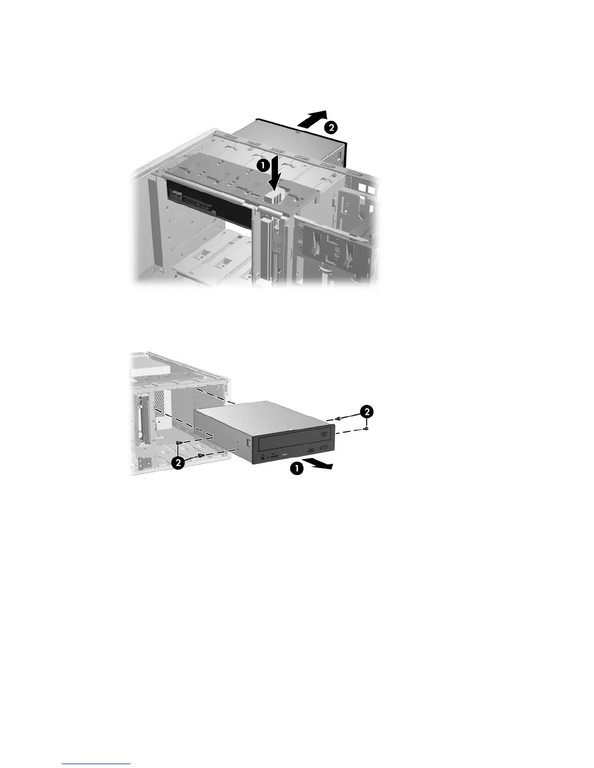 7. After removing the drive (1), remove the four guide screws from the drive (2) if you plan to install