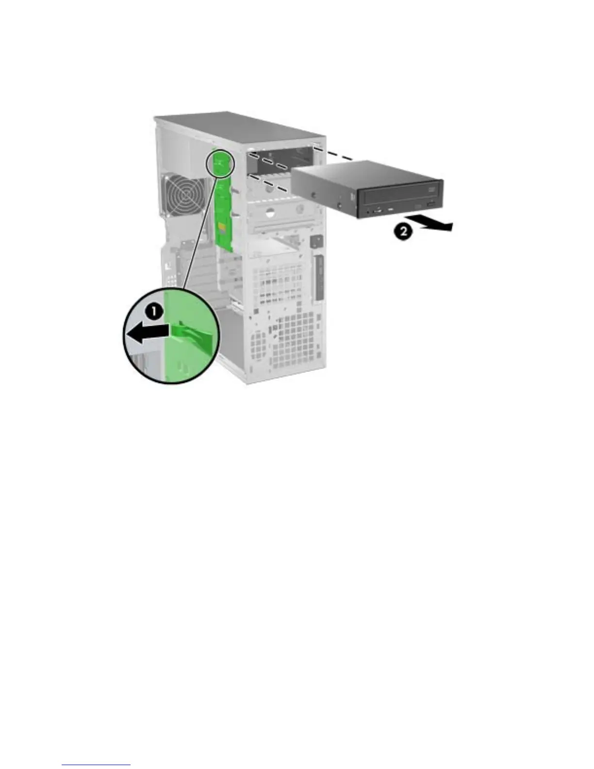 7. Lift the green drive-lock release lever (1) and gently slide the drive out of the chassis (2) as shown