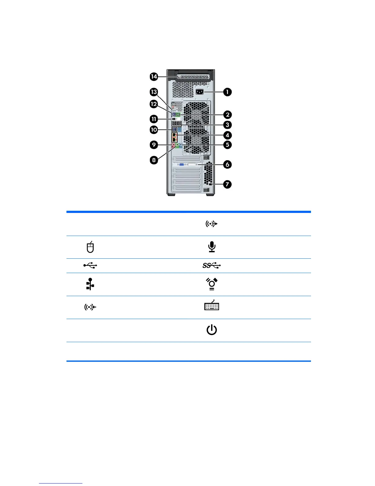 Audio line-in connector (blue) 12 PS/2 keyboard connector (purple)
