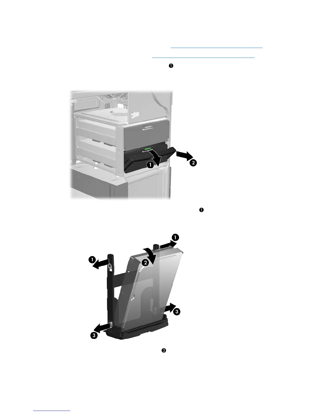 4. Carefully separate the upper hard disk drive carrier rails, and then tilt the drive outward