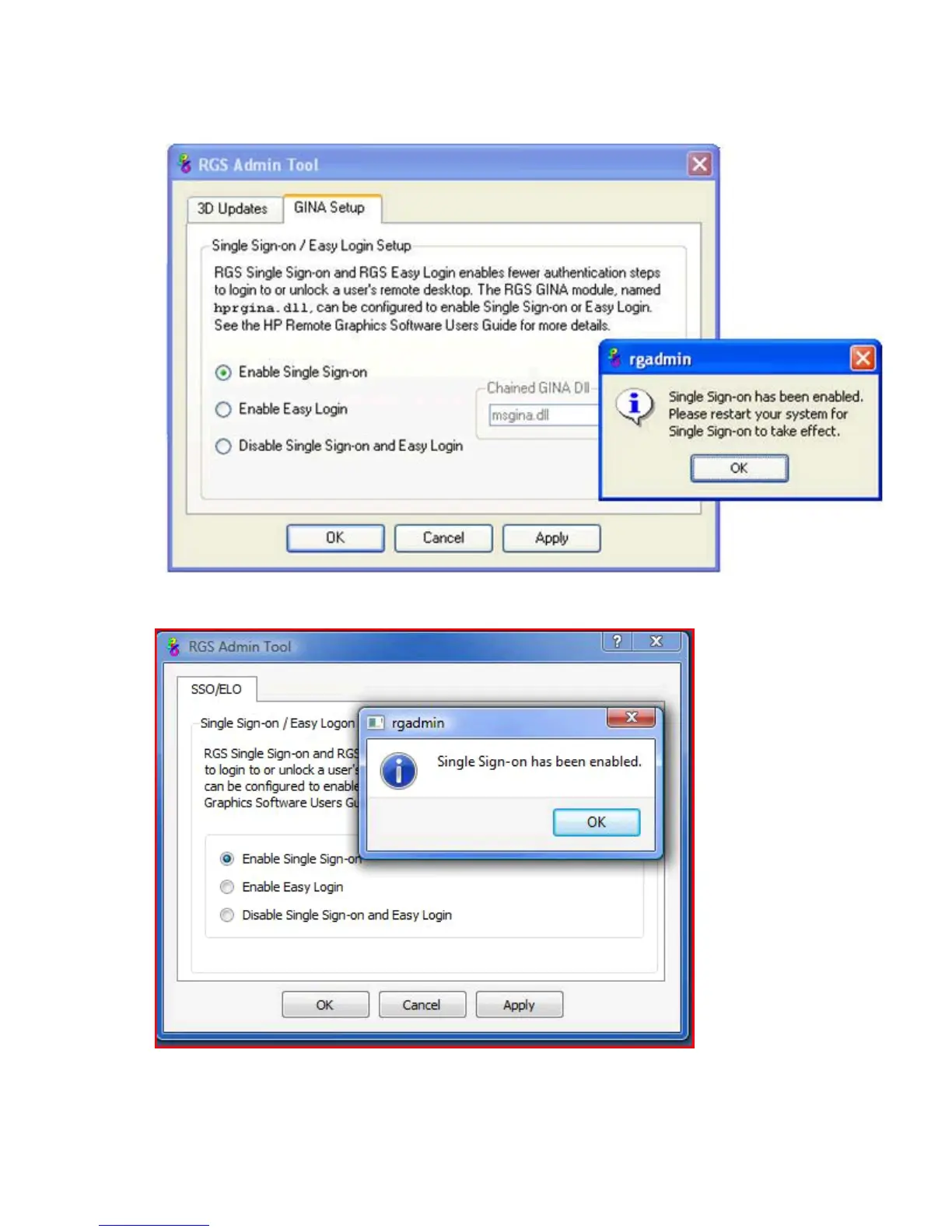 Figure 3-9 Using the rgadmin tool to enable Single Sign-on (Windows XP Professional)