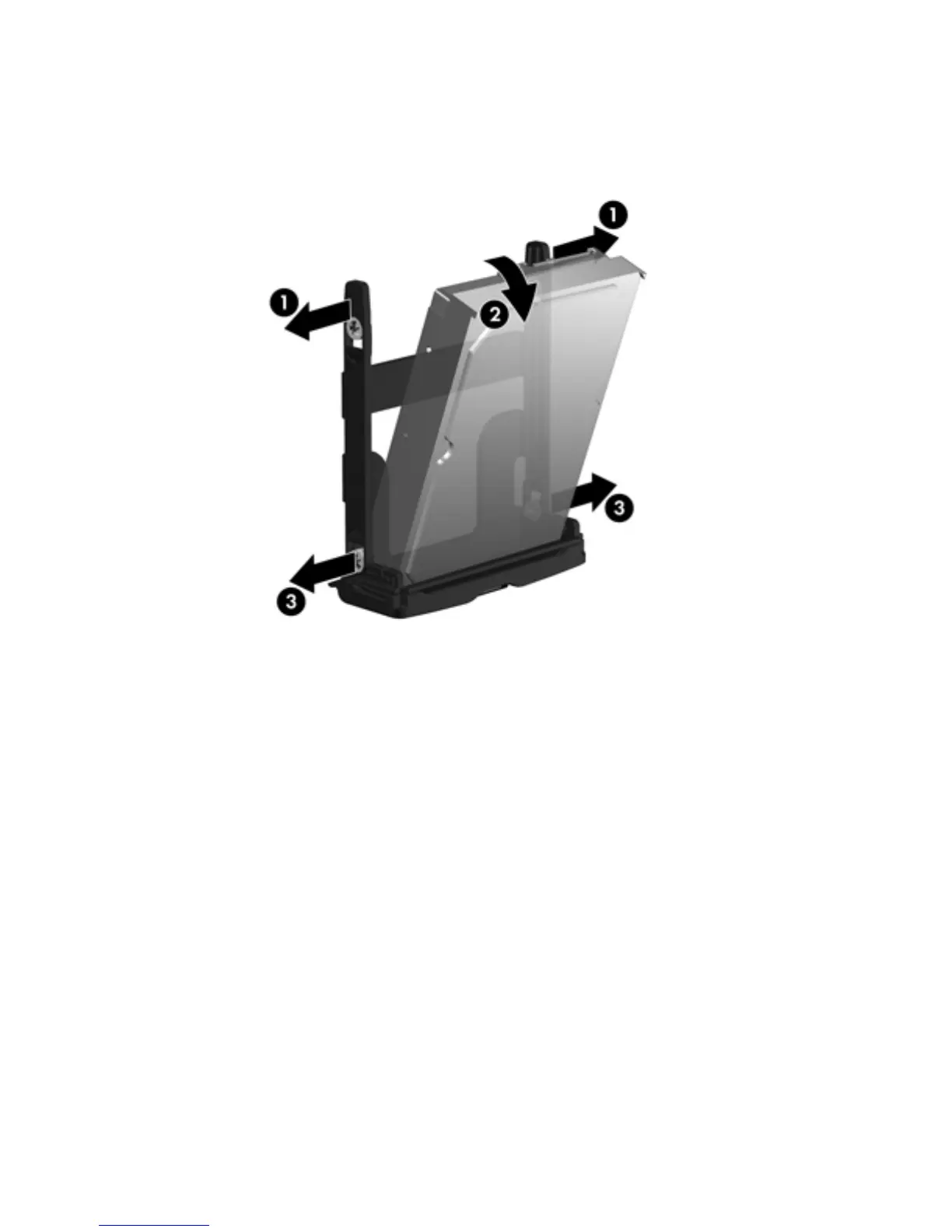 Carefully separate the upper hard drive carrier rails (1), tilt the drive outward (2), carefully