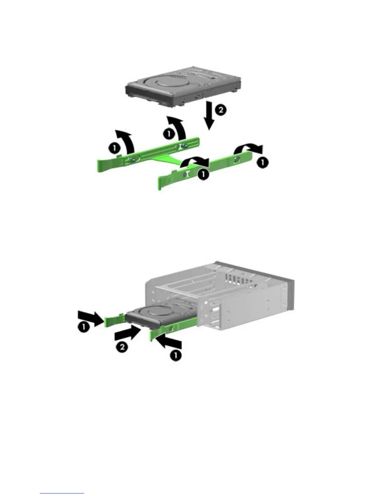 Carefully squeeze the green tabs (1) while sliding the drive with rails into the drive bracket (2), as