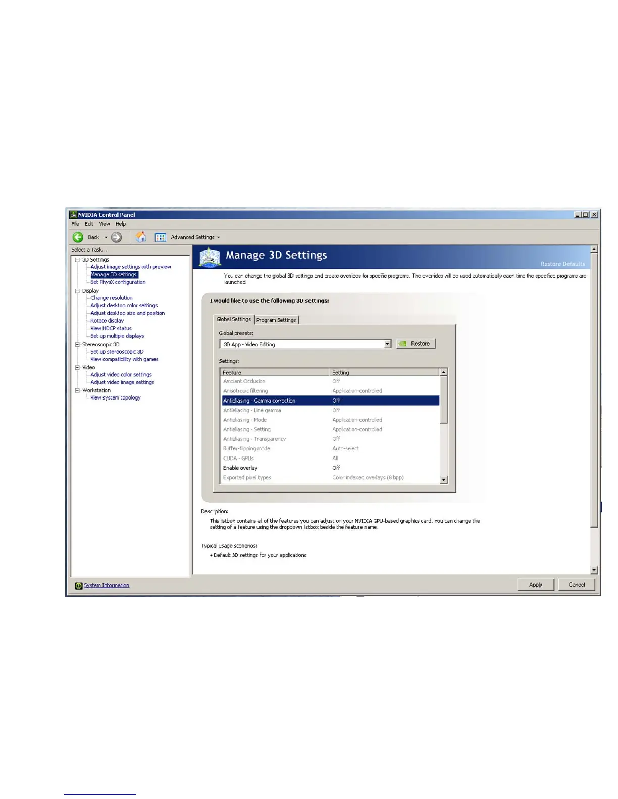 16. Under “Global Settings” tab select “3D App-Video Editing” setting as shown in picture below: