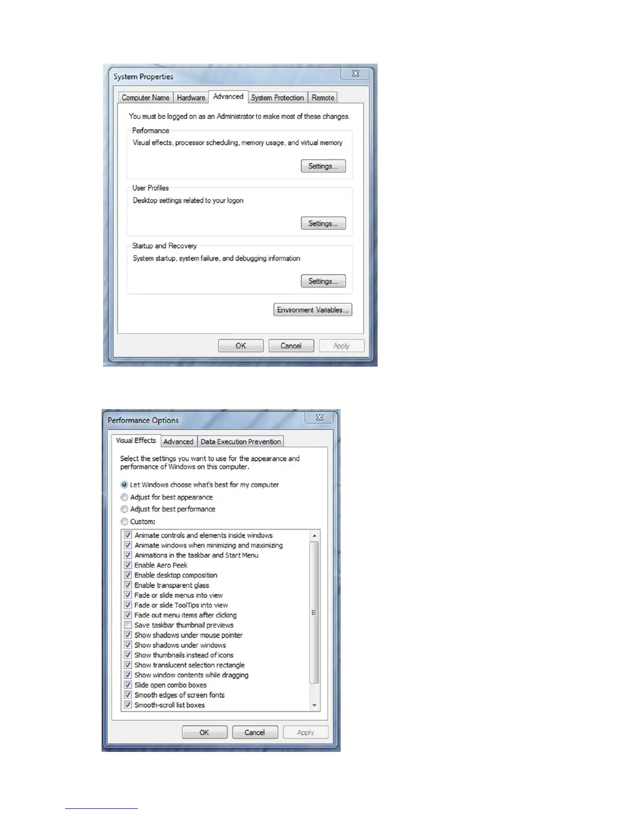 7. The “performance Options” window will be displayed. (Picture below).
