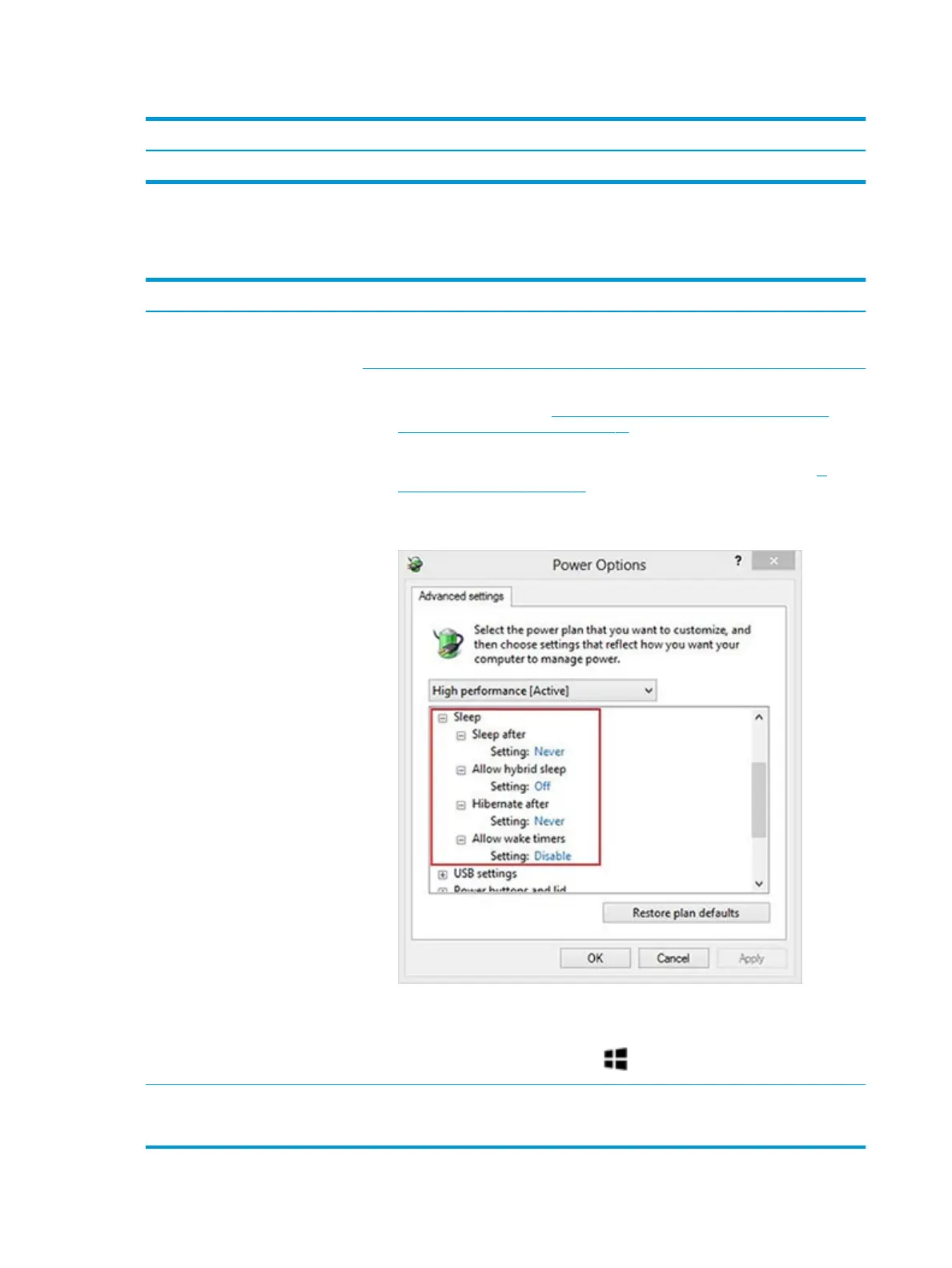 3. Verify power management settings in Windows Power Options. Disable Sleep options if