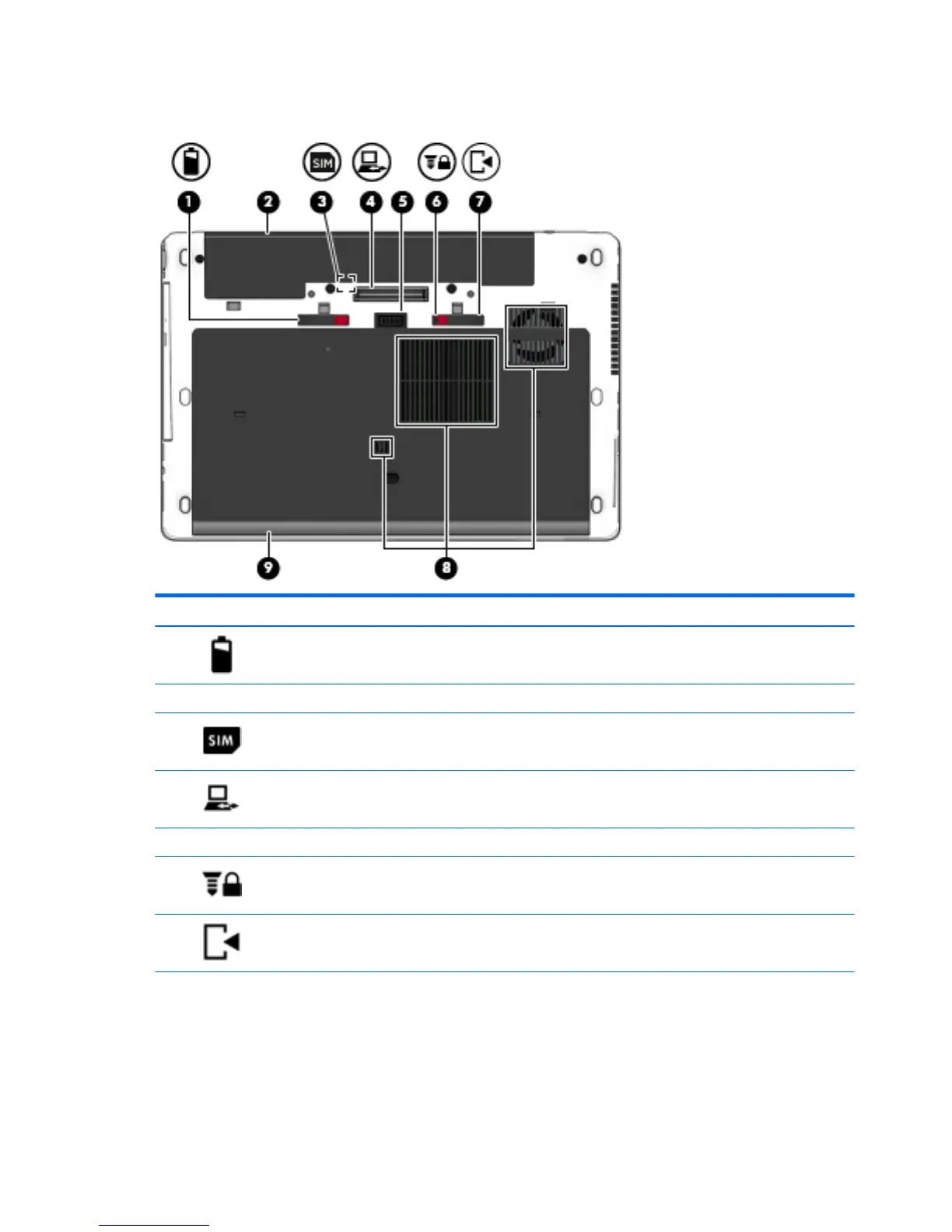 (1) Battery release latch Releases the battery from the battery bay.