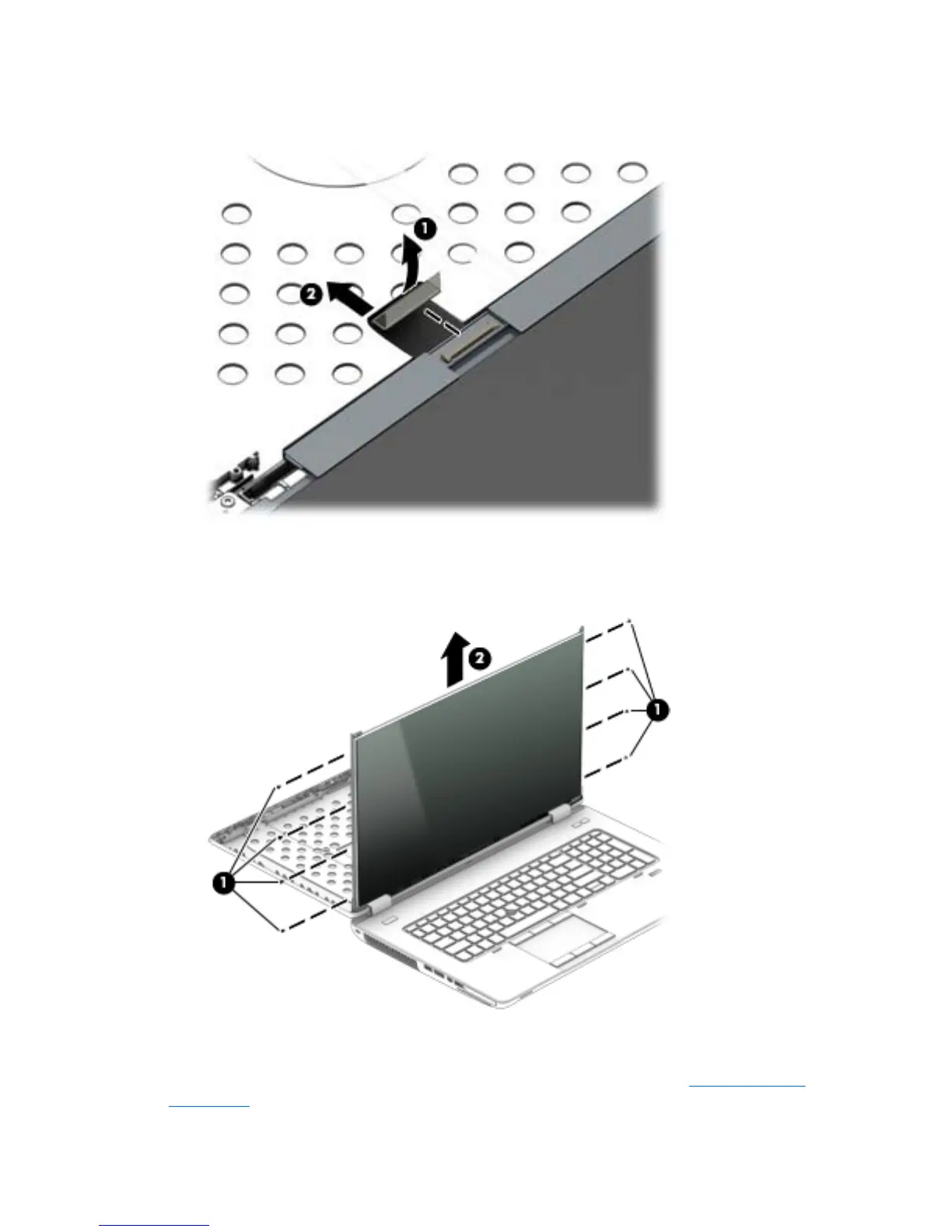 3. Lift the tape that covers the connector on the back of display panel (1), and then disconnect the
