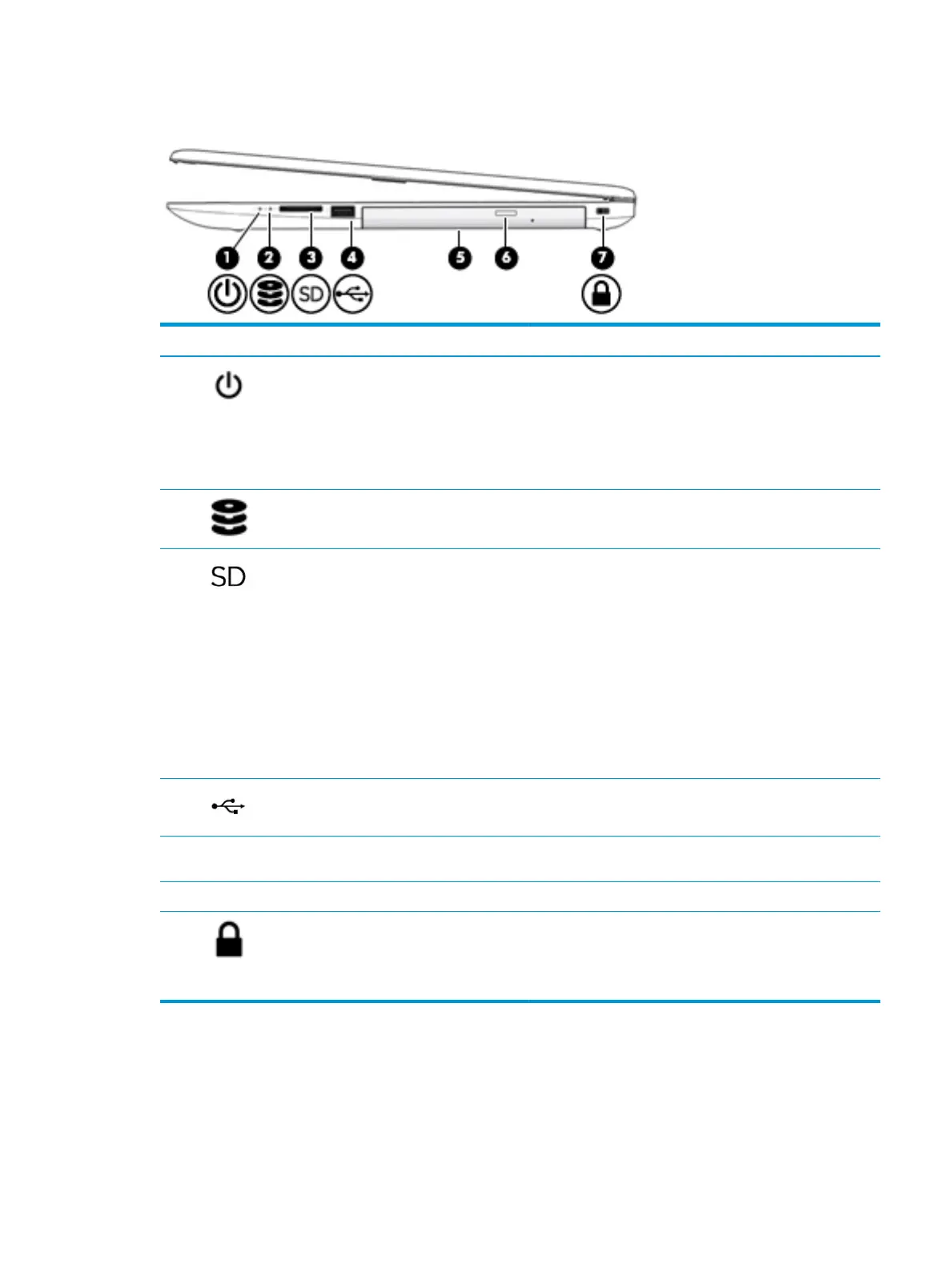 (6) Optical drive eject button Releases the optical drive disc tray.