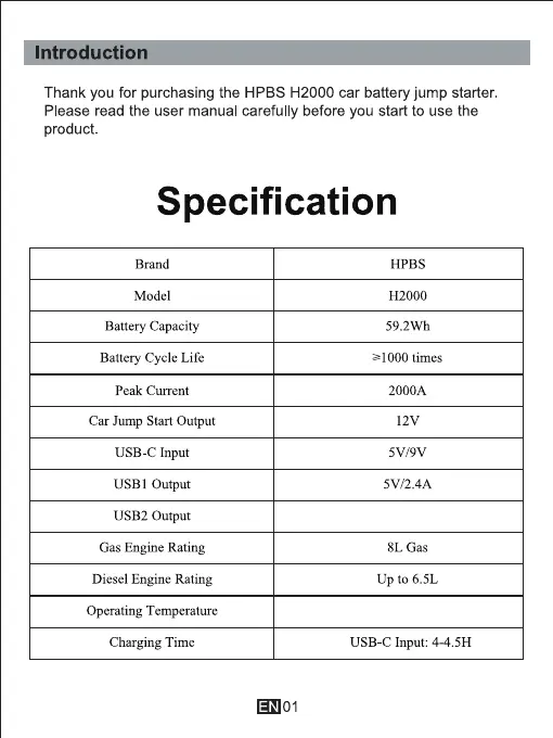 HPBS H2000 - Introduction to HPBS Jump Starter; HPBS 2000 A Jump Starter Specifications