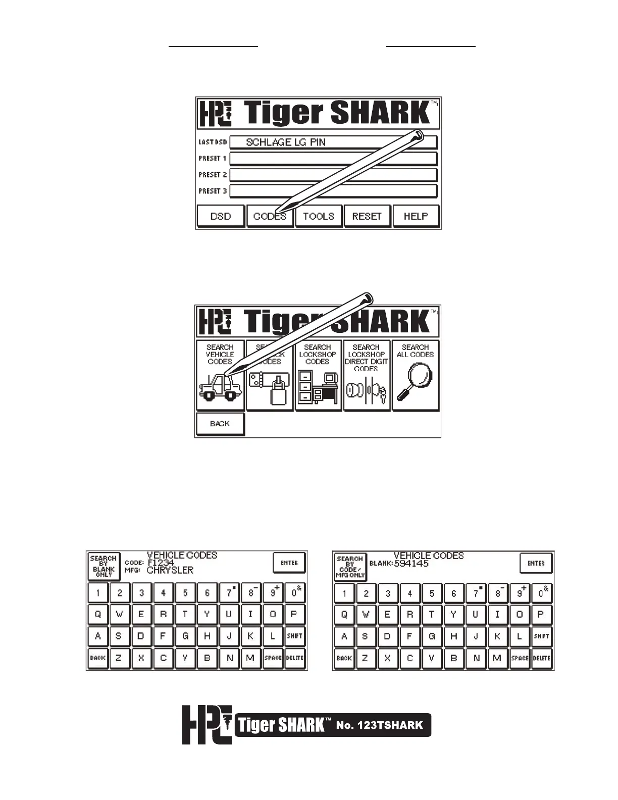 Code or by Manufacturer. Type in information with Stylus and then press ENTER.
