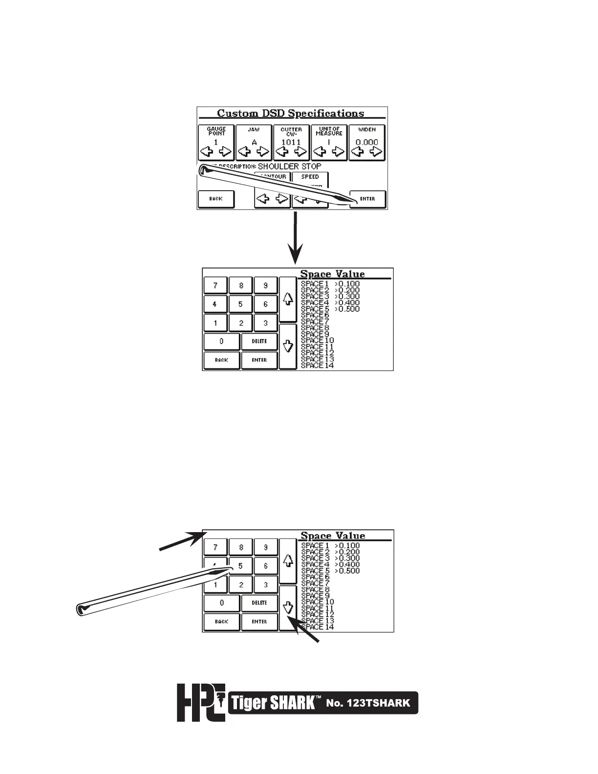 8. At this screen, enter Space Values one at a time by typing in a number in thousandths of an inch or hundredths