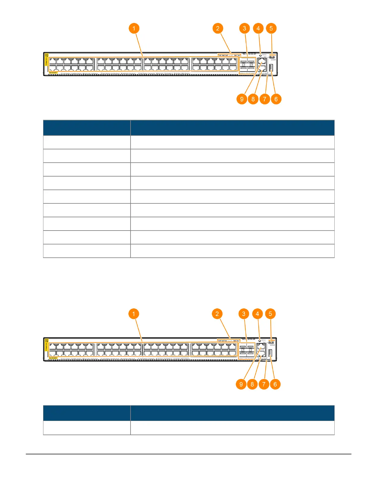 Figure 10 Switch and port LEDs for 6200F switches:HPE Aruba Networking CX 6200F 48G Class 4 PoE 4SFP+