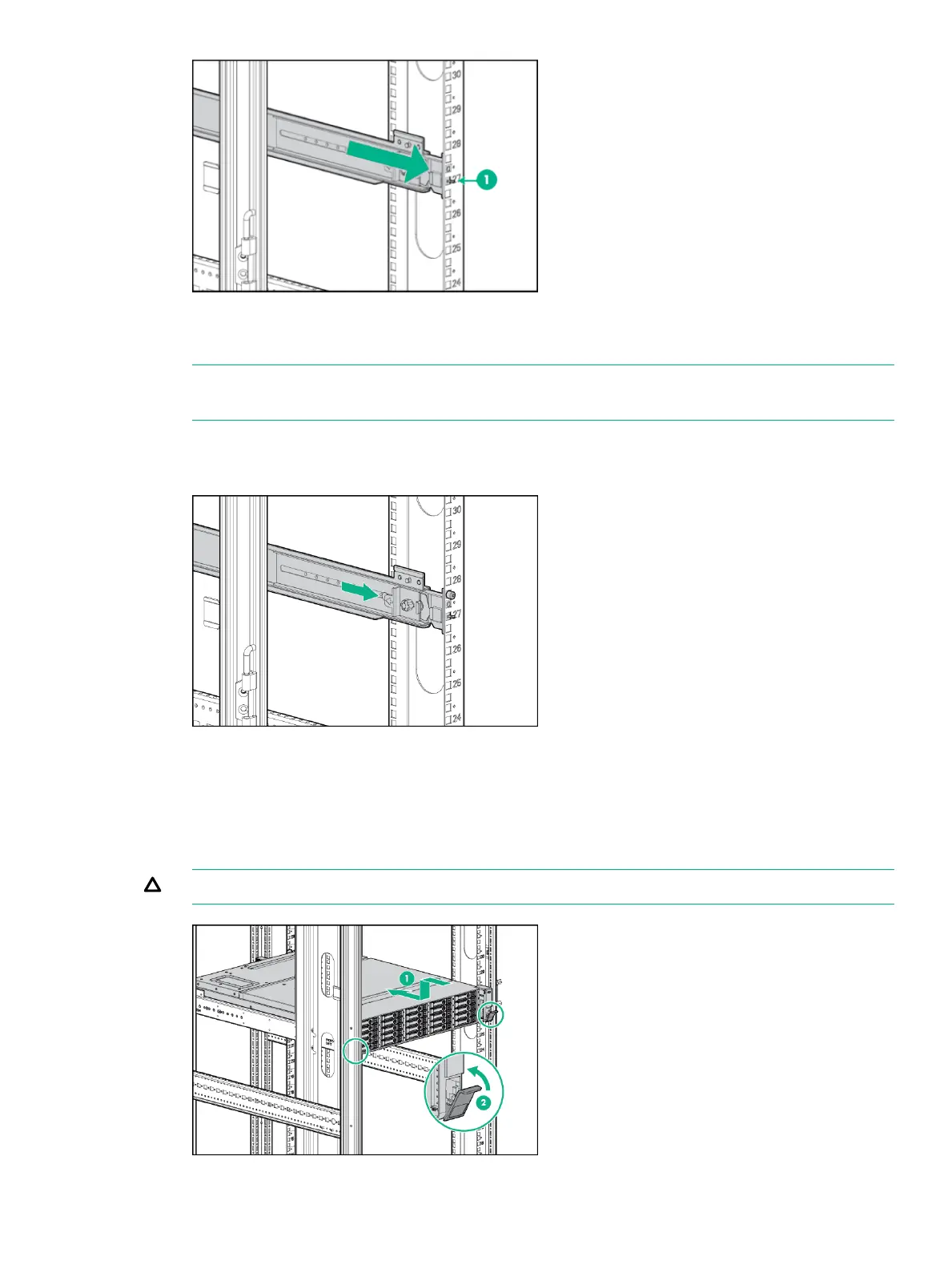 7. Slide the enclosure into position on the rails (1). Secure the chassis into the rack by tightening