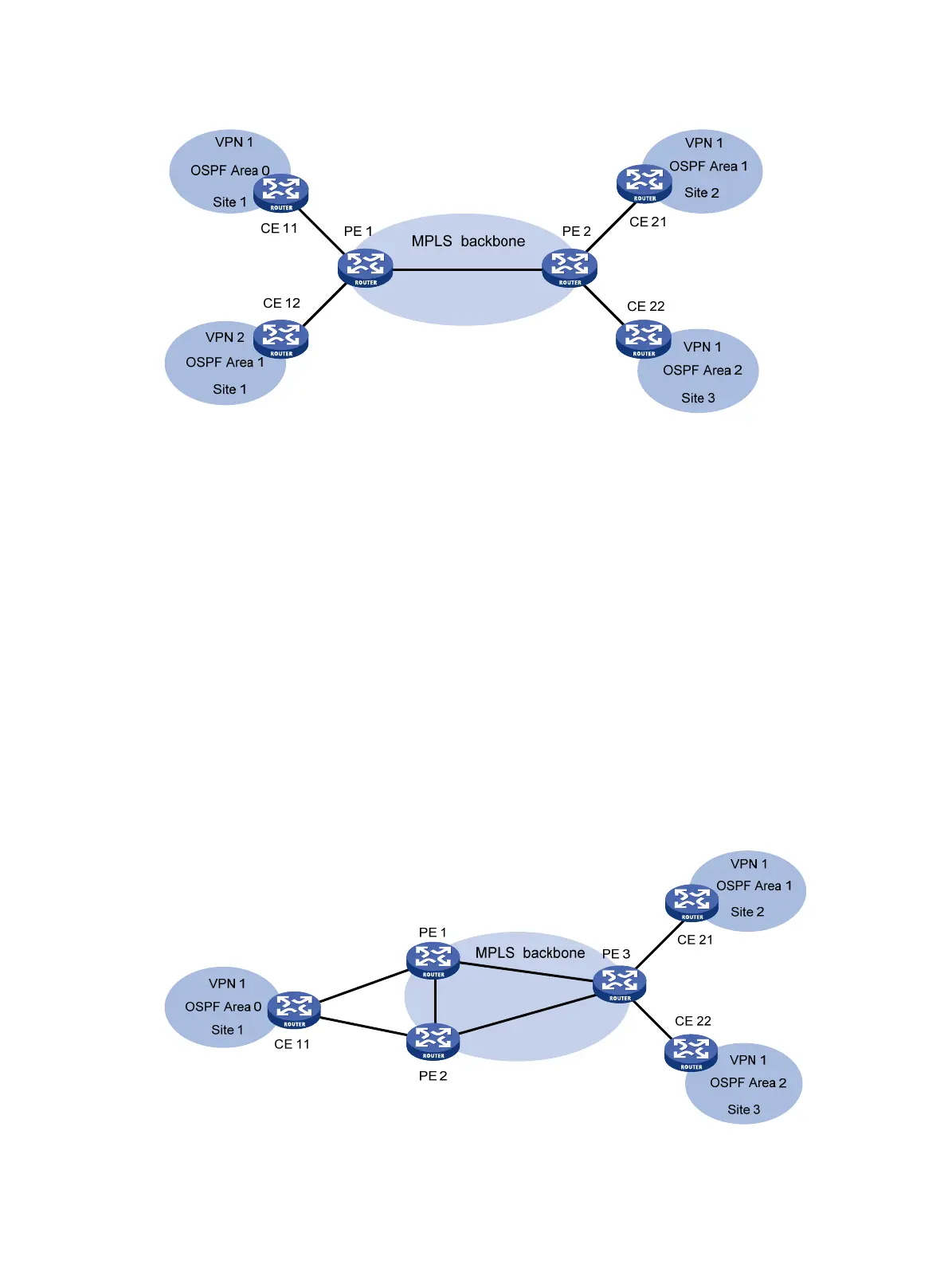 As shown in 776HFigure 59, CE 11, CE 21, and CE 22 belong to the same VPN and the same OSPF