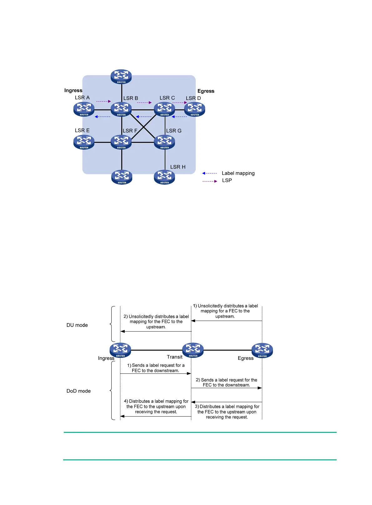 • Downstream Unsolicited (DU) mode—Distributes FEC-label mappings to the upstream LSR,