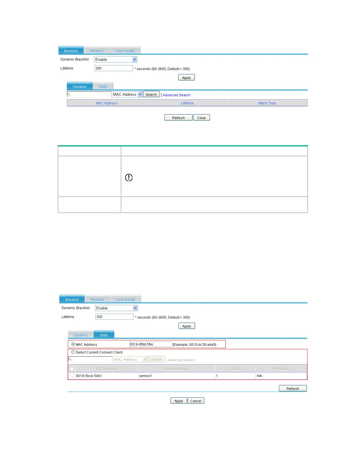 On the blacklist configuration page as shown in Figure 108, select the Static tab to enter the static