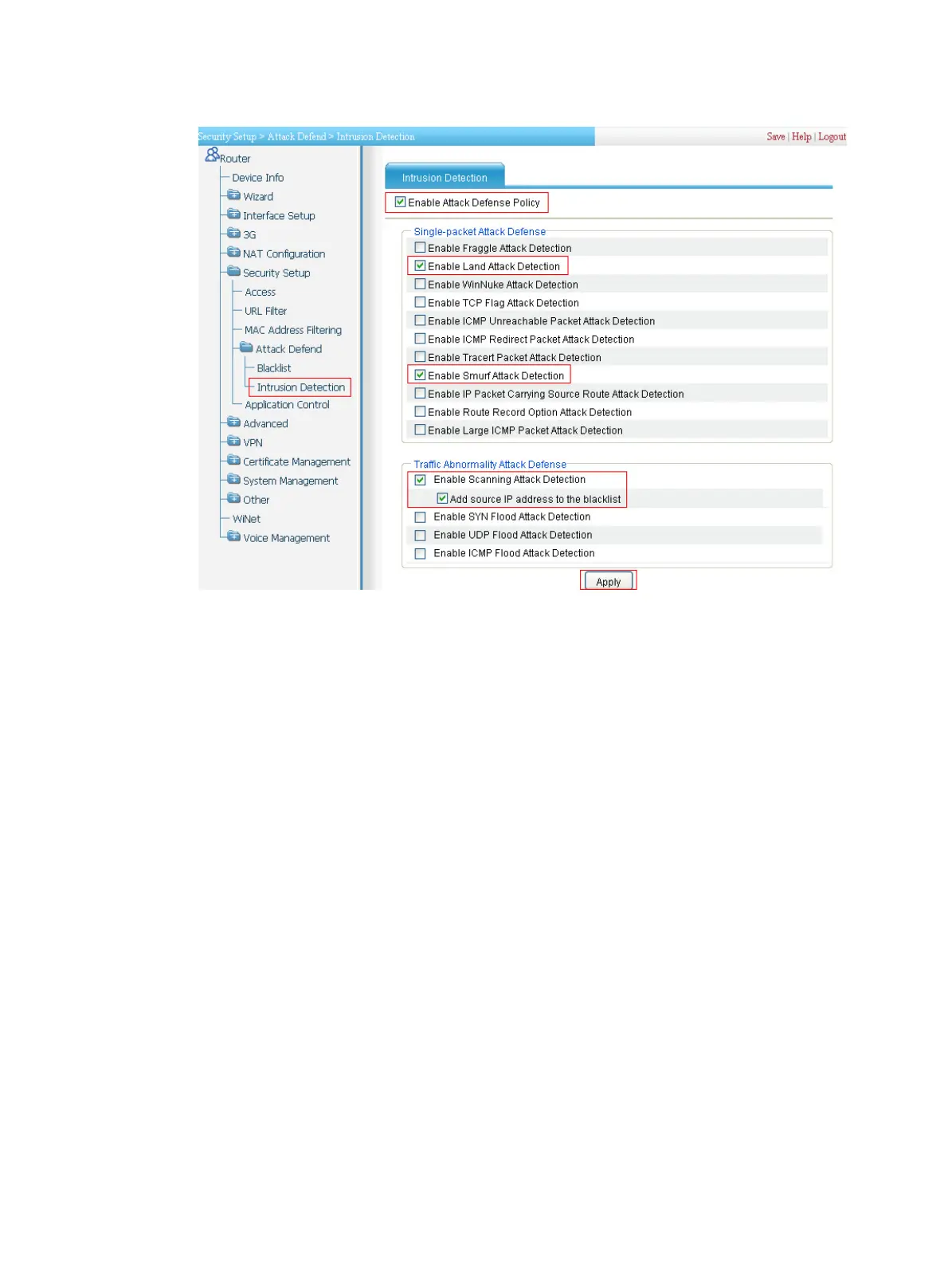 • Select Enable Land Attack Detection, Enable Smurf Attack Detection, Enable Scanning