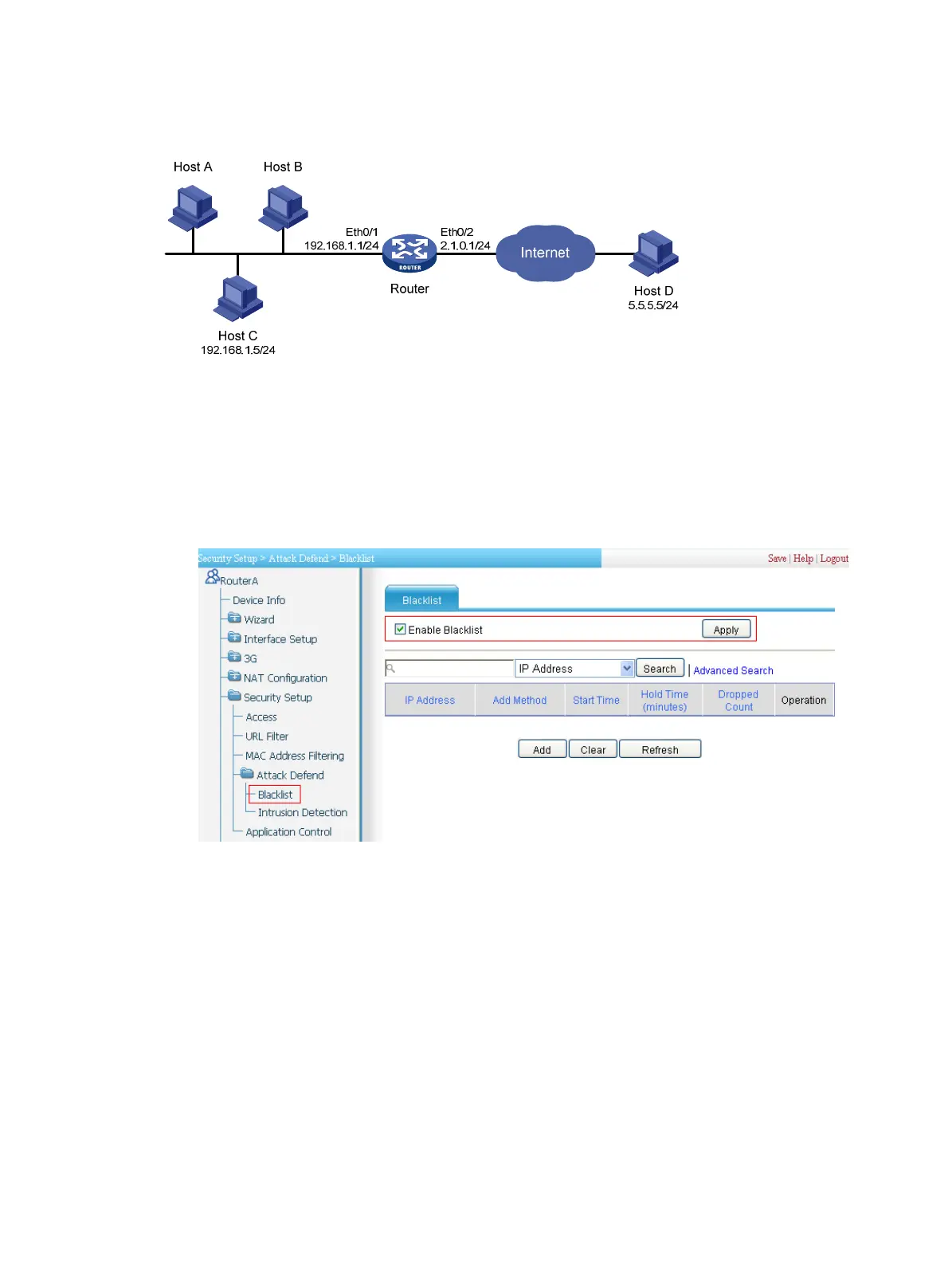• Select Security Setup > Attack Defend > Blacklist from the navigation tree, and then perform