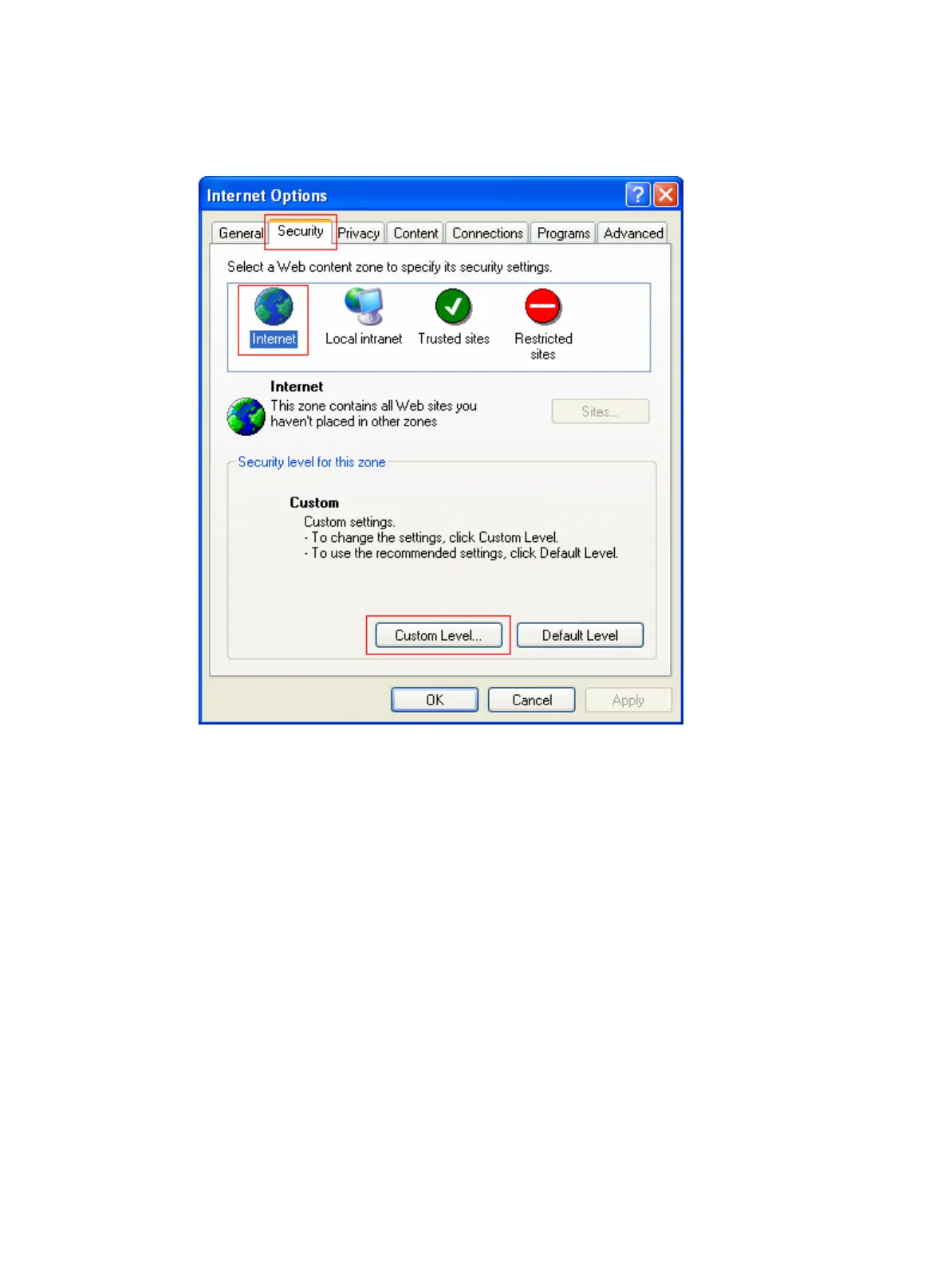 2. Click the Security tab, and then select a Web content zone to specify its security settings, as