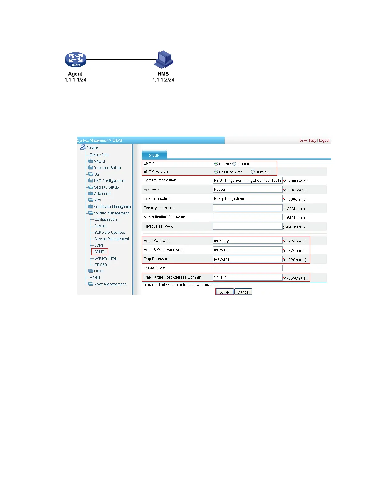 1. Select System Management > SNMP from the navigation tree, and then perform configuration