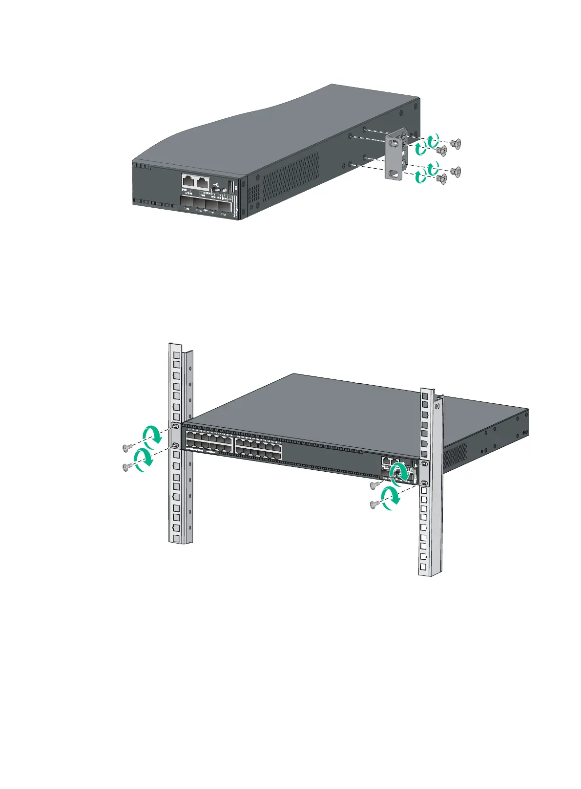 Figure 9 Mounting the switch in the rack (front mounting brackets at the port side)