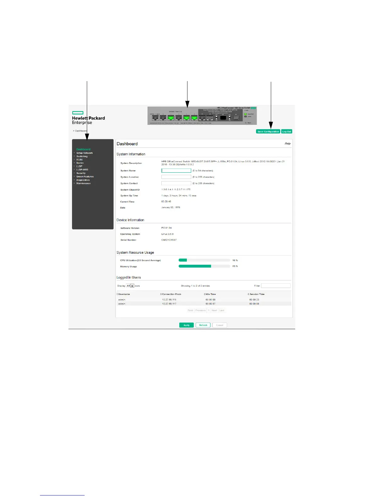 The graphical switch displays summary information for the switch LEDs and port status. For informa-