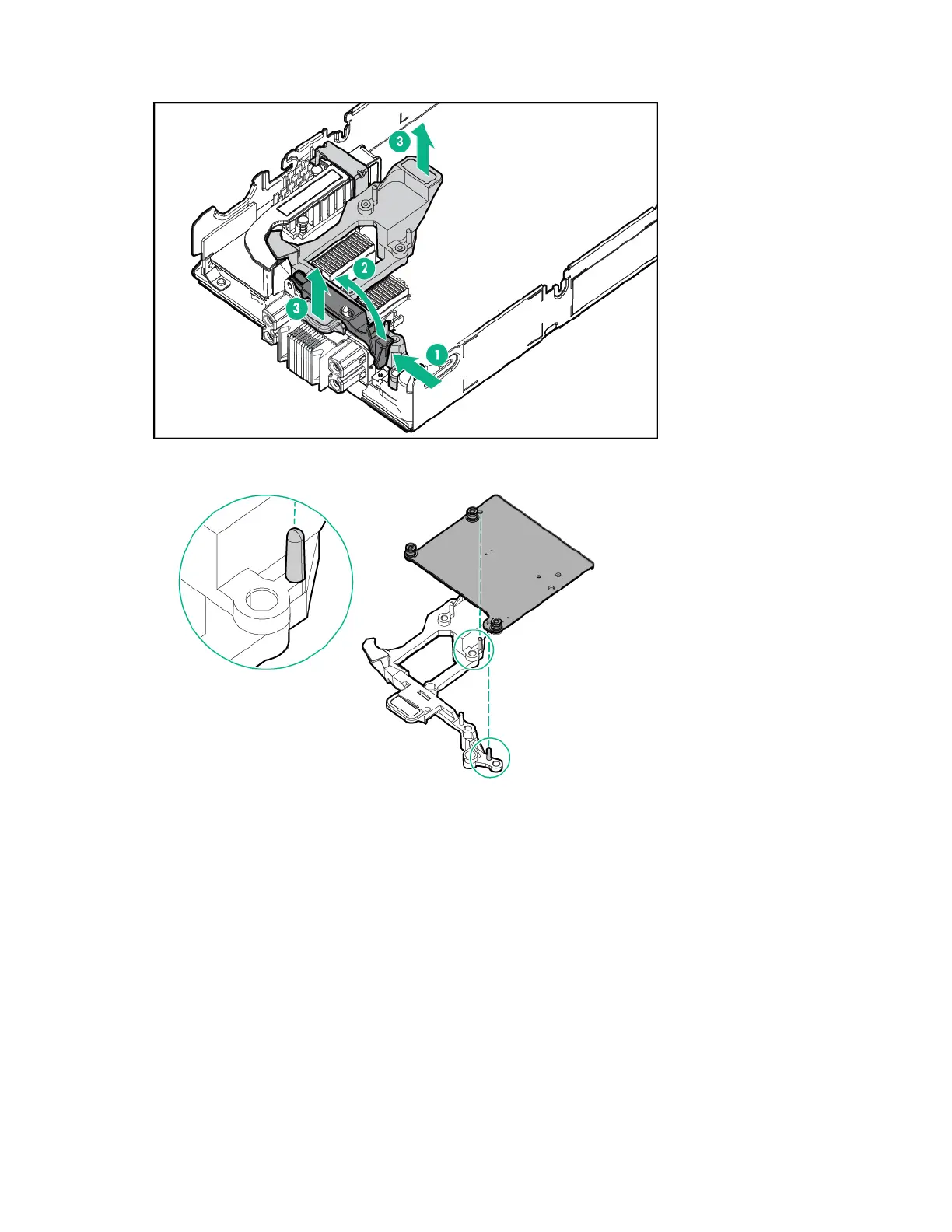 6. Align the mezzanine card with the guide pins on the mezzanine assembly.