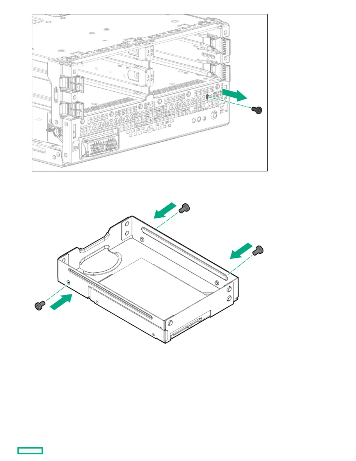12. Install the three screws removed from the front panel on the left and right sides of the drive converter tray.