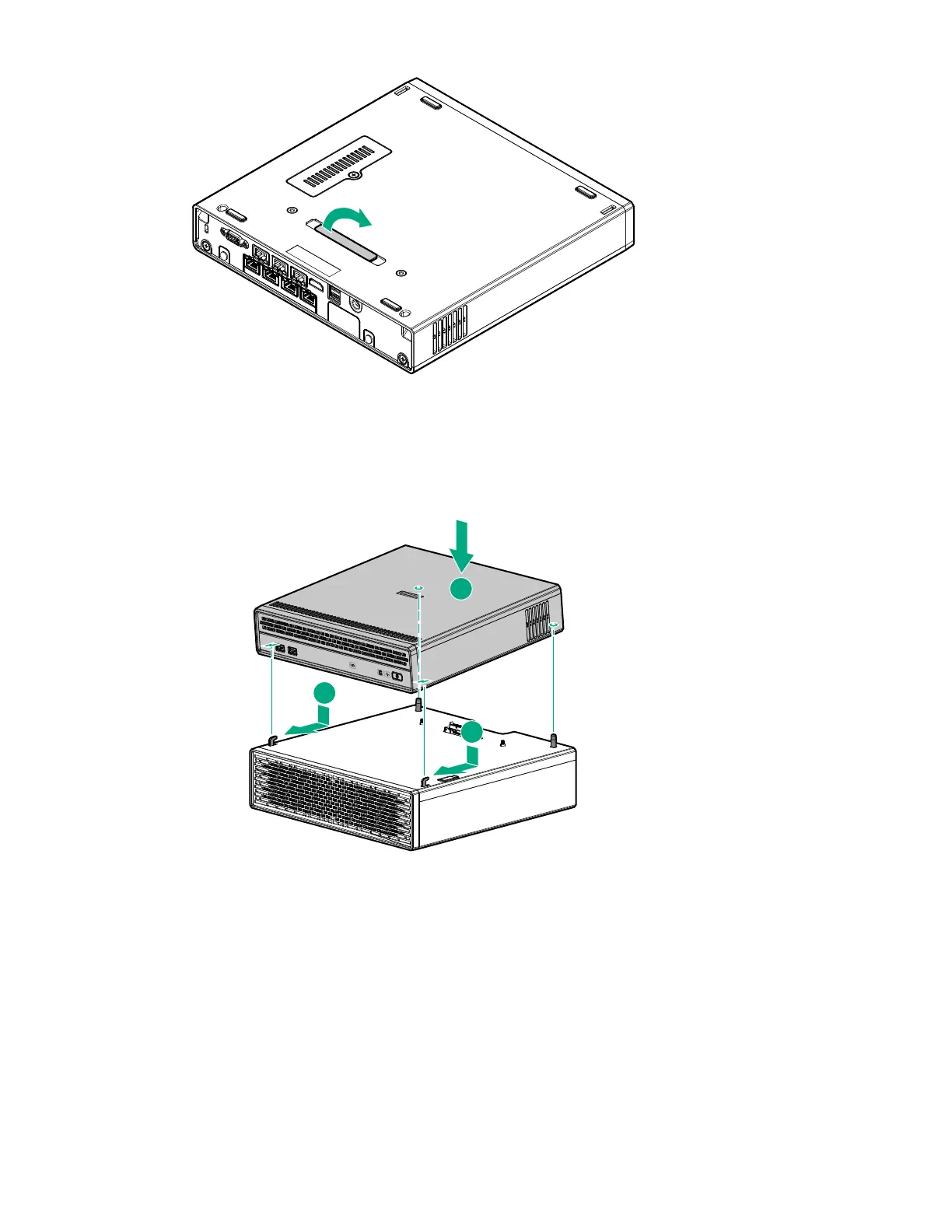 2. Insert the two hooks on top of the storage expansion unit into the corresponding openings on the bottom of