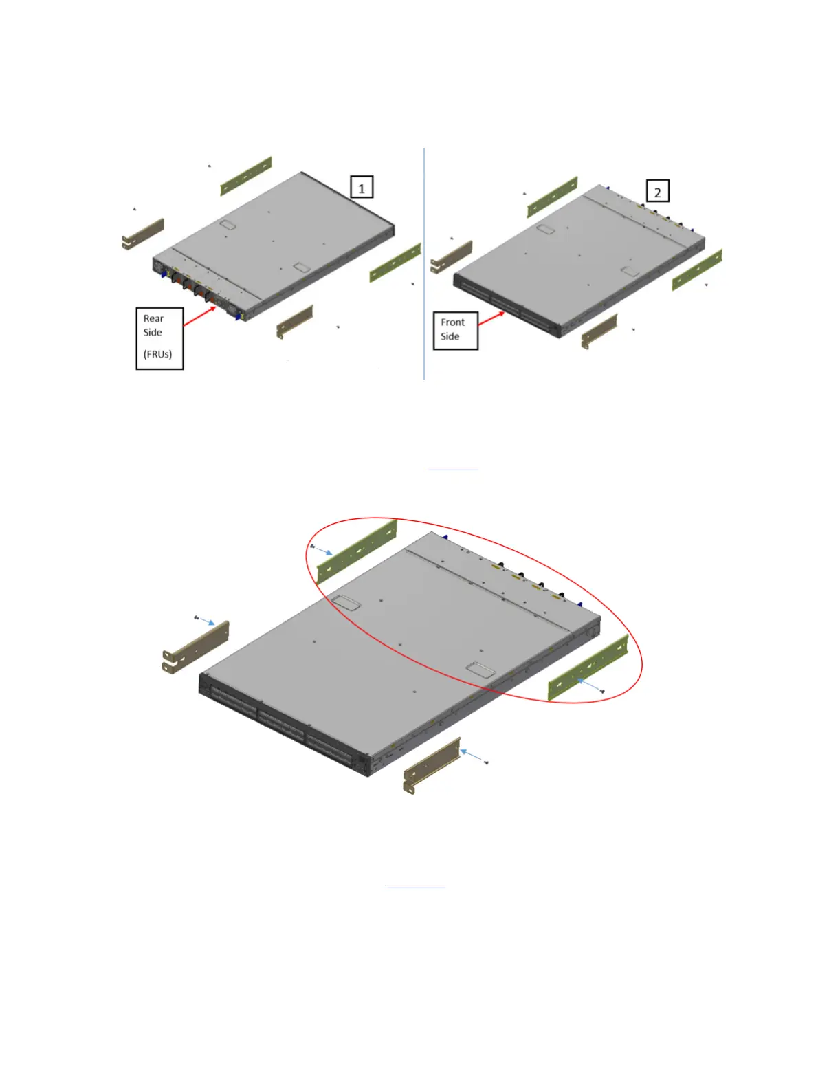 Step 2. Secure the chassis in the rails by screwing 2 flat head Phillips screws (E) in the designated