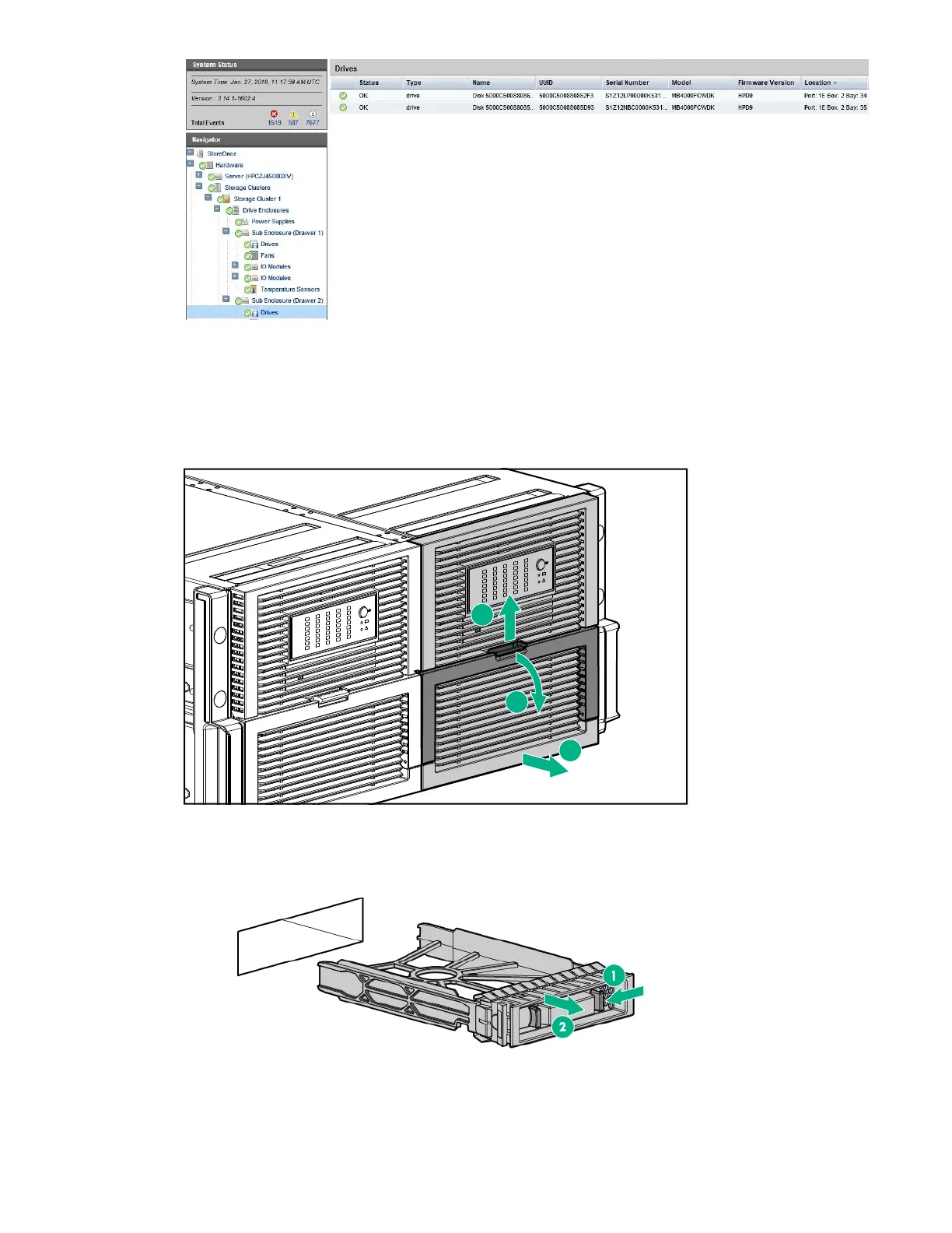 a. Open the hard drive drawer for drawer 2. Pull the handle up (1) and out (2) to extend the drawer