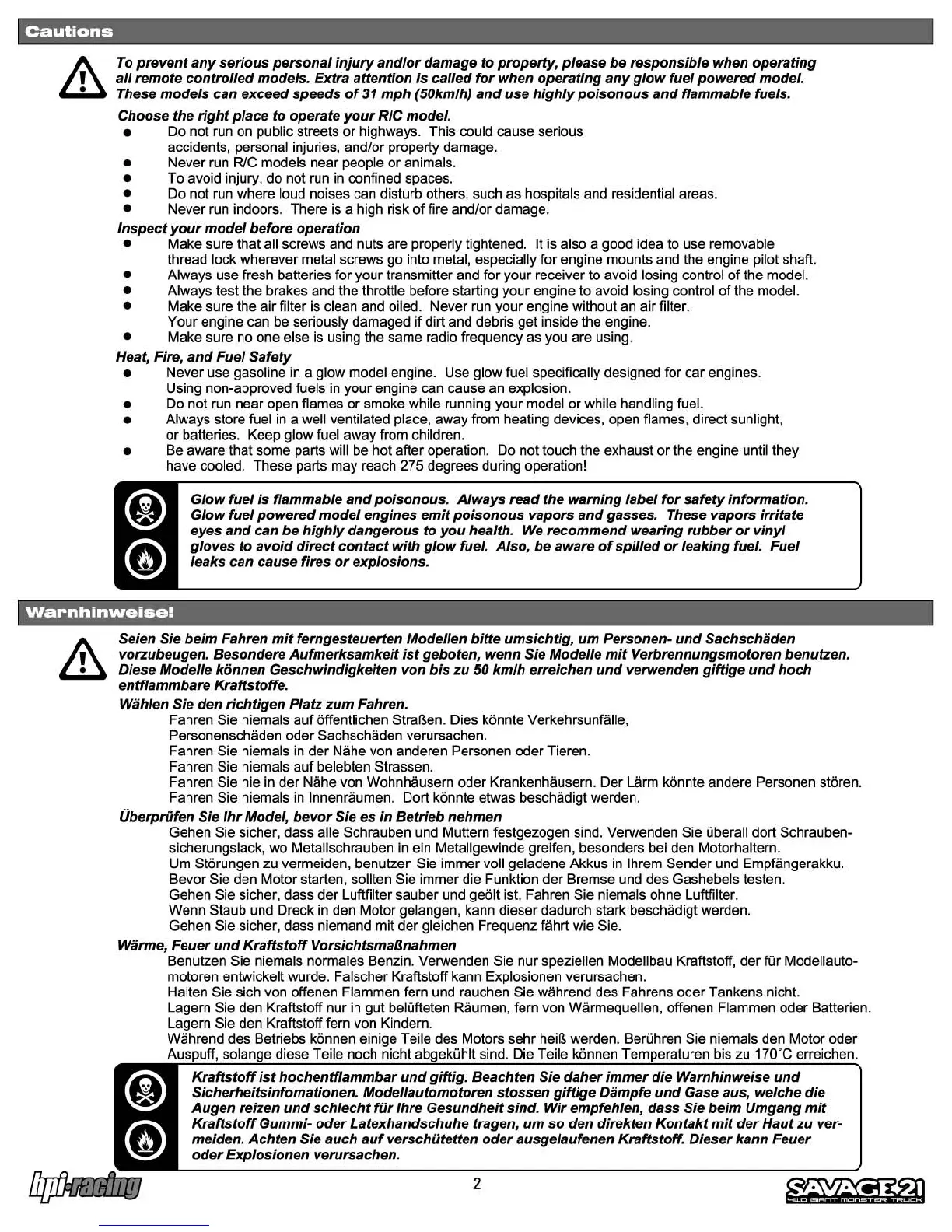 HPI Racing Savage 21 - Safety and Precautions; Safe Operating Locations; Pre-Operation Checks; Fuel and Fire Safety