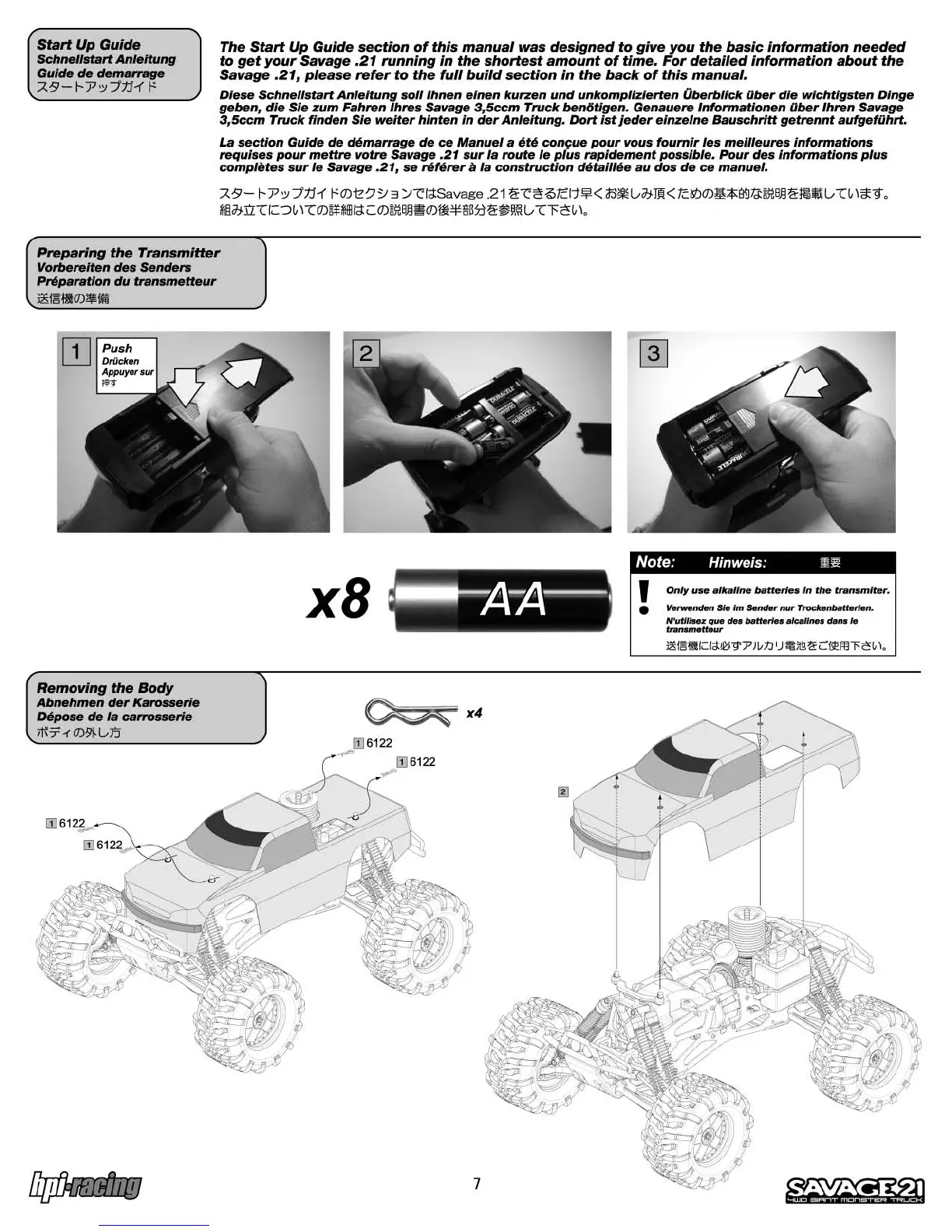 HPI Racing Savage 21 - Getting Started; Transmitter Preparation; Body Removal
