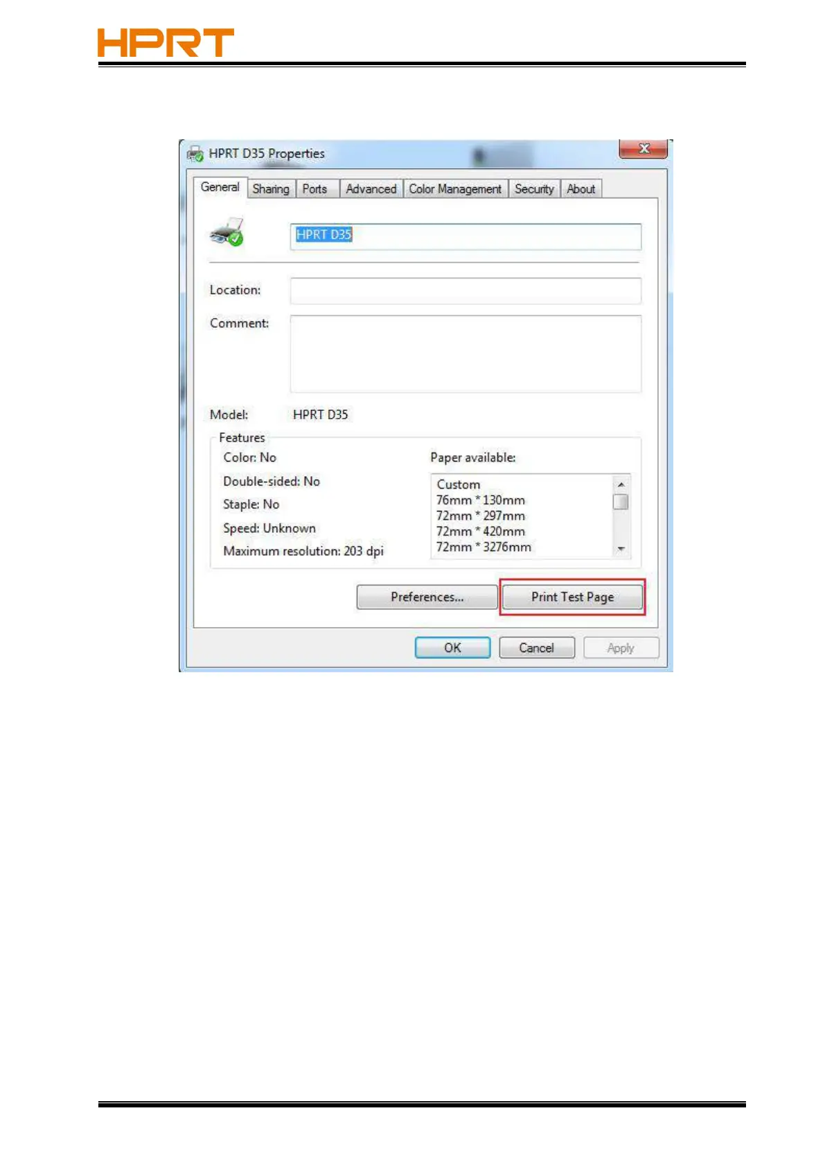 2.Click “General”→“Print Test Page”, and printer will print labels with current settings.